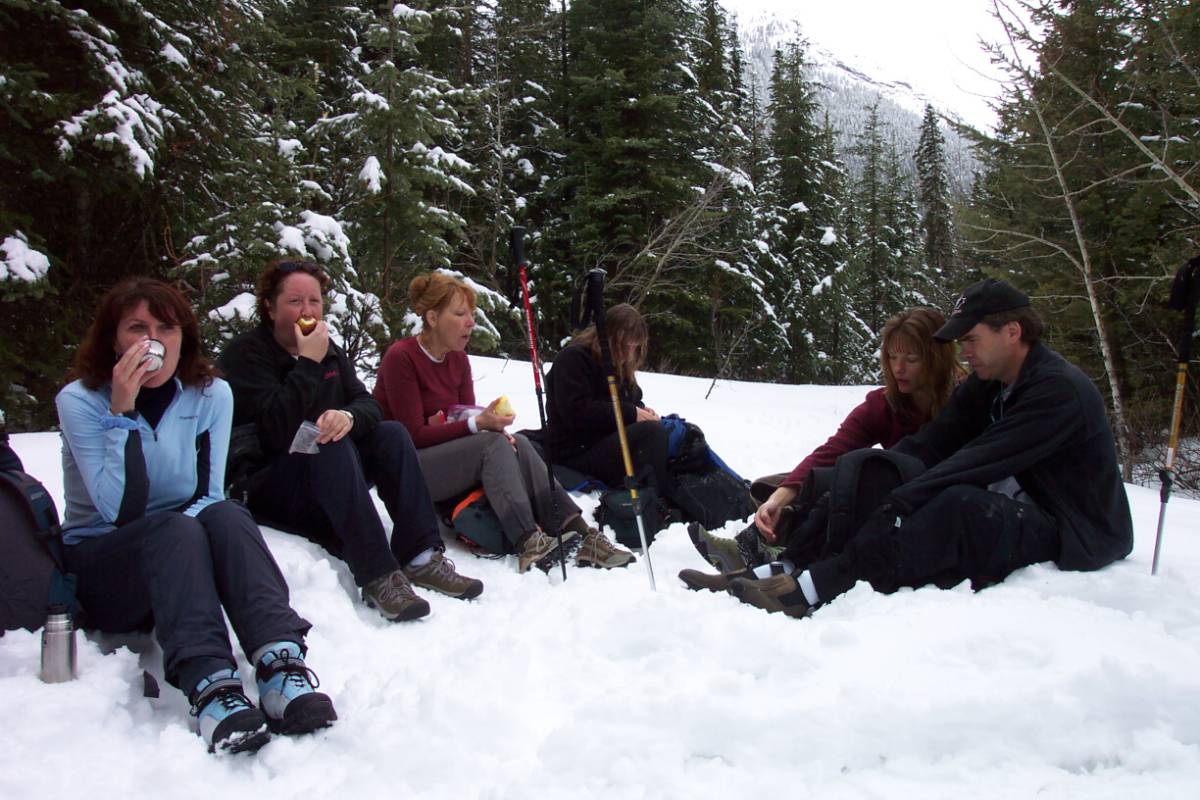 This was a great little hike and one that we highly recommend to someone looking for an easier hike, or a good "first hike of the season". The hike from the Heart Mountain trailhead to the junction where Quaite Valley trail meets Prairie View and Jewell Pass is about 12km round trip. If you want more, you can go up and back on Prairie View, or on Jewell Pass, or head back and do Heart Creek as an addition. The trail itself starts at Heart Mountain and heads west on the Quaite Creek montain bike trail, which is a continuation of the trail that comes from the Heart Creek Day Use parking lot. The trailhead is just a few feet before the yellow "scramble warning" sign for the Heart Mountain trailhead. Follow the Quaite Creek Trail to the junction where this trail ends. Here you will find a very wide, gravel trail which will take you 1.6km east to the Quaite Valley Backcountry Campground. Beyond the campground, the trail once again becomes a proper trail which takes you to the junction for Jewell Pass and Prairie View. This would also make a great beginner mountain bike route. Anyway, we had a really fabulous day, despite some disappointment when we first saw the wide gravel trail, but after the campground we found a lot of snow and iterated our thanks to Marty, Veronique and Jason for breaking trail for the rest of us wimps up to the trail junction. Because of the deep snow, we did not continue on Jewell Pass or Prairie View, but rather, stopped and had lunch and then headed back. Marty made the first COC snow-woman. Half of us did Heart Creek as an add-on, and some did the requisite Kilkenny add-on as well. -- Rhonda |