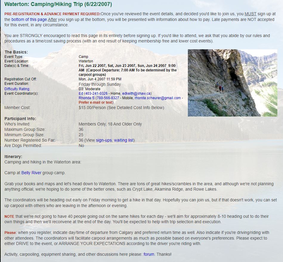 Thanks for organizing the Waterston trip, it was a blast!! Shabu is still talking about the Crypt lake hike, it was a real challenge for him, but he is happy he did it again after 10 to 12 years. He says he is 10 to 12 years older, wiser & stronger !!! On Sunday we hiked Rowe Lake, he found it easy, I wonder if the hike was easy or easier than Crypt Lake!!! Thanks again to Brad for helping us out at the Crypt Lake hike. -- Shaida Friday: We did a long hike (17km) with something god awful like 900m elevation gain on the "must do" Crypt Lake hike. We started out with the 15 min boat ride across Waterton Lake. This was a great way to start off the morning. We broke up into a faster and slower group. Along the way we saw at least 3 waterfalls, lots of beautiful flowers and some great vistas. The speed demons left me in their dust. Ed was incredibly inspiring as he scampered up the hike ahead of a couple slow pokes like me. The ladder, tunnel and traverse were much less intimidating than the hiking books led some of us to believe. Crypt lake was beautiful with snow melting into it from all around. A small group led by Phil, who still had energy to burn, hiked all the way around the lake to the USA side. None of them had passports with them but fortunately there was no US border control to contend with. Unfortunately (or fortunately) we did not see any bears on this hike. We did however see some beautiful looking flowers like lady slippers, Alberta wild roses, and Indian paintbrushes plus a cool looking plant called "Bear grass". We all made it back to the boat with time some time to spare before crossing back to Waterton. Saturday: The early birds and keener hikers vacated the campground before 9am. Some of us took a little more leisure time to wake up and stretch our sore muscles after a strenuous hike the day before. A small group of us decided to work our upper bodies instead today. A short drive to Cameron Lake and we got to enjoy more beautiful scenery. We kayaked around Cameron Lake and enjoyed the waterfalls on the USA side. Back in town nachos and beer were in order. The rest of the day was filled with R&R as we guarded camp with beverages in hand. Sunday: The campground was deserted by 9:30am and just a few of us stragglers remained to clean up. We decided to do an easy hike to Crandell Lake. A couple adventurous people decided to actually swim in the lake fully clothed. You can ask Cindy R. or Juan for more details on why they decided to do that. The rest of us sane people stayed dry and enjoyed the scenery. It was a good time in Waterton. Other than a bit of rain and the odd wind gust (how many times did my tent hit me in the face??) we had lots of good weather. A note for some, remember to bring ear plugs next time as you just never know who your neighbours might be. Also, it is a really good idea to bring your own sleeping bag and tent with you....right Joe? -- Juliet Thanks Rhonda for a lovely camping/hiking trip to Waterton. I had a fabulous time and memorial experience. I learned a lot about other people. Ed is incredible man who is physically and mentally strong and out-hiked most younger people. He never seem to be tired because he paced himself throughout the hike so I nicked name him "Eddy Steady". Ed gives me a lot of motivation. I hope I am half as strong as him when I am his age. Unlike Ed, Marco is young and risk-taker who is wild and afraid of nothing. On Crypt Lake hike, I watched Marco walked to the edge of a cliff and setting up a tripod to take some pictures of the cliff and waterfalls. For Marco it was nothing and normal; for me I was terrified. Renata and Gord taught me various ways on how to tie knots and save oneself from falling off snow cliff. These are the only few people that I remembered by names; others are just as incredible. Everyone was so nice and friendly. I would recommend to anyone that never hiked to do it. A million thanks to you Rhonda for a great weekend. -- Peter Thank you for coordinating this hike ! one of my favorite places I have traveled. Spent thursday night sharing Lora'z tent since I seemed to have been soo excited I didnt bring my tent Sleeping bag or pillow. SHe helped me so that I didnt freeze and later on friday my friends brought out more of my stuff and theirs to help me out. Crypt lake and the weather were stellar. My tent was fasioned out of a very large tarp and I was surprising warm and not bothered by any bugs. Many fun memories and and stunning photos to keep bringing back to visit that amazing area. -- Joe |