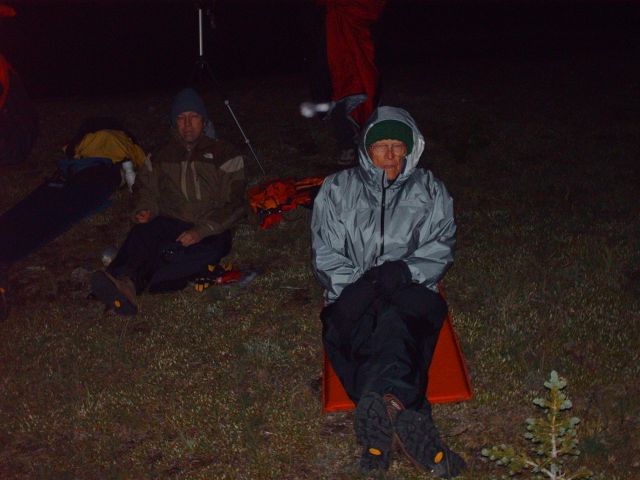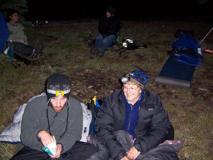 Finally, after a three-year wait we got to do this again! We did it the first time in 2004, and it was awesome, although most of us weren't quite prepared for how cold it would get up there. 2005 didn't work out because of clouds/rain and 2006 didn't work out because of a full moon. This time, it was pretty cloudy all day. The hourly forecast showed the sky clearing in Bragg Creek at around 7:00 or 8:00 and then getting cloudy again around 1AM. We decided to take our chances and believe the weatherman. It was cloudy as we hiked up, with just a few smidgens of blue sky showing. When we reached the top, it was pretty overcast and stayed that way 'til after 10:00 but then stars started popping up and that's when I became hopefully that we'd actually see the meteors. There were a million stars out by the time we spotted the first unmistakable meteor making it's brief, firey shot across the sky. Marty and a couple others said that there were a LOT of meteors (about 12 or so) in the half hour from 3:30 - 4:00. Funny, I didn't notice any during that time! It was chilly and somewhat windy staying up top, but most people took my warning seriously and were pretty prepared for that. I woke up in the morning to about half the group still there, and as there were no discernable weak cries for help as we hiked down, I'm assuming that all who relied on the glow sticks to find their way did just fine. We watched the beautiful red sunrise and then hiked down. Thanks to everyone for coming out - I hope you had a great time! -- Rhonda It was a blast! the hike up was fun and lots to see, as was the hike down! The meteors were fun especially when as one streaked across the sky leaving its cosmic skid mark on the sky, everyone would oooh and aww and even clap out loud! The weather was good, and I am surprised to say I was nice and toasty in my sleeping bag, a definite for any future hike of this kind, as those without usually left due to being cold. Was fun and met some really great people, some of whom went out for breakfast the next morning! Have tones of pics so if anyone wants them just let me know! Actually it would be great to know the names again of some of the people I even took photos of! Was my first COC event, and I must say it was great to finally get out into the Mountains again and meet a bunch of new people! Plus it was my first ever real sleepover under the stars, you know without the tent being there too! -- JenWile |
