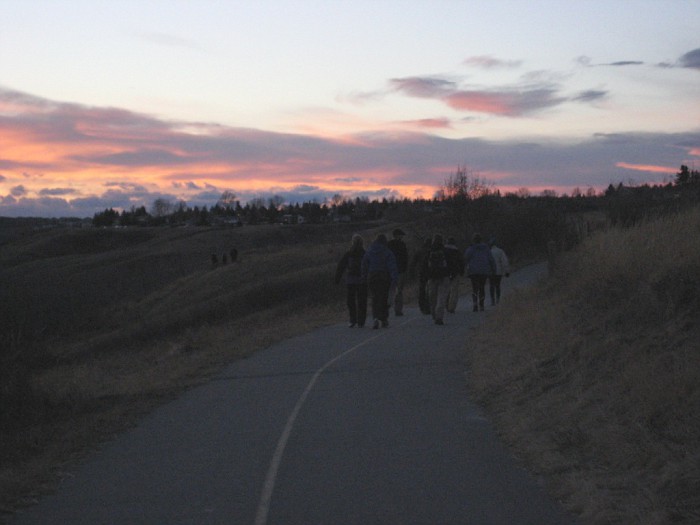| Gale force winds could not stop nine hearty souls from venturing out on Bowmont Hill on Tuesday evening. Although the wind was strong, the air was quite mild. We enjoyed a vigorous walk up and down several hills, stopping at the small waterfalls on the way. We were treated to a nice sunset - followed by some fairly bright colours. Next time we'll try for a little more red. We were back at the cars before 8 pm. Thanks evyone for joining in and making it such a pleasant evening. |