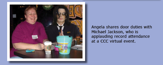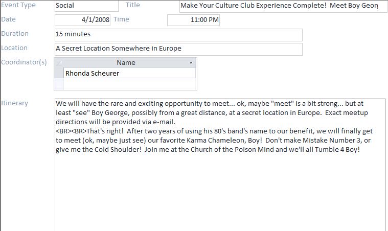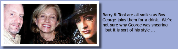 We will have the rare and exciting opportunity to meet... ok, maybe "meet" is a bit strong... but at least "see" Boy George, possibly from a great distance, at a secret location in Europe. Exact meetup directions will be provided via e-mail. That's right! After two years of using his 80's band's name to our benefit, we will finally get to meet (ok, maybe just see) our favorite Karma Chameleon, Boy! Don't make Mistake Number 3, or give me the Cold Shoulder! Join me at the Church of the Poison Mind and we'll all Tumble 4 Boy! As a friend of Mr. Ciaro, who got me backstage, I was able to ask Boy George about the club's name and his feelings on it. He said it was alright, but he perferred the 'indoor club'. Mr. Roebotto, my other guest, is very gratefull and says, Thank you! - Cynthia We had a great turn-out, and thanks to Cynthia's back-stage connections, we got much closer to Boy George than we ever expected. It is so nice after all this time wondering that he approves of our use of the name 'Culture Club'. We have often received the suggestion from David M, as well as Boy George, to change our name to 'Indoor Club', but hey, we've gone to outdoor concerts and plays and stuff, so David and Boy can just live with it. Thanks to Cynthia for getting all 65 of us back stage into Boy's dressing room (what happens in the dressing room stays in the dressing room) and to Lori for being the official club photographer! - Rhonda |