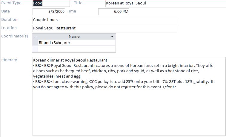 Royal Seoul Restaurant features a menu of Korean fare, set in a bright interior. They offer dishes such as barbequed beef, chicken, ribs, pork and squid, as well as a hot stone of rice, vegetables, meat and egg. CCC policy is to add 25% onto your bill - 7% GST plus 18% gratuity. If you do not agree with this policy, please do not register for this event. |