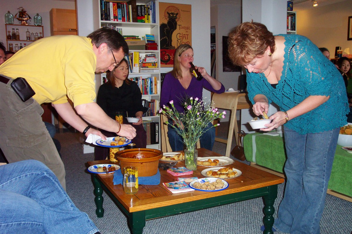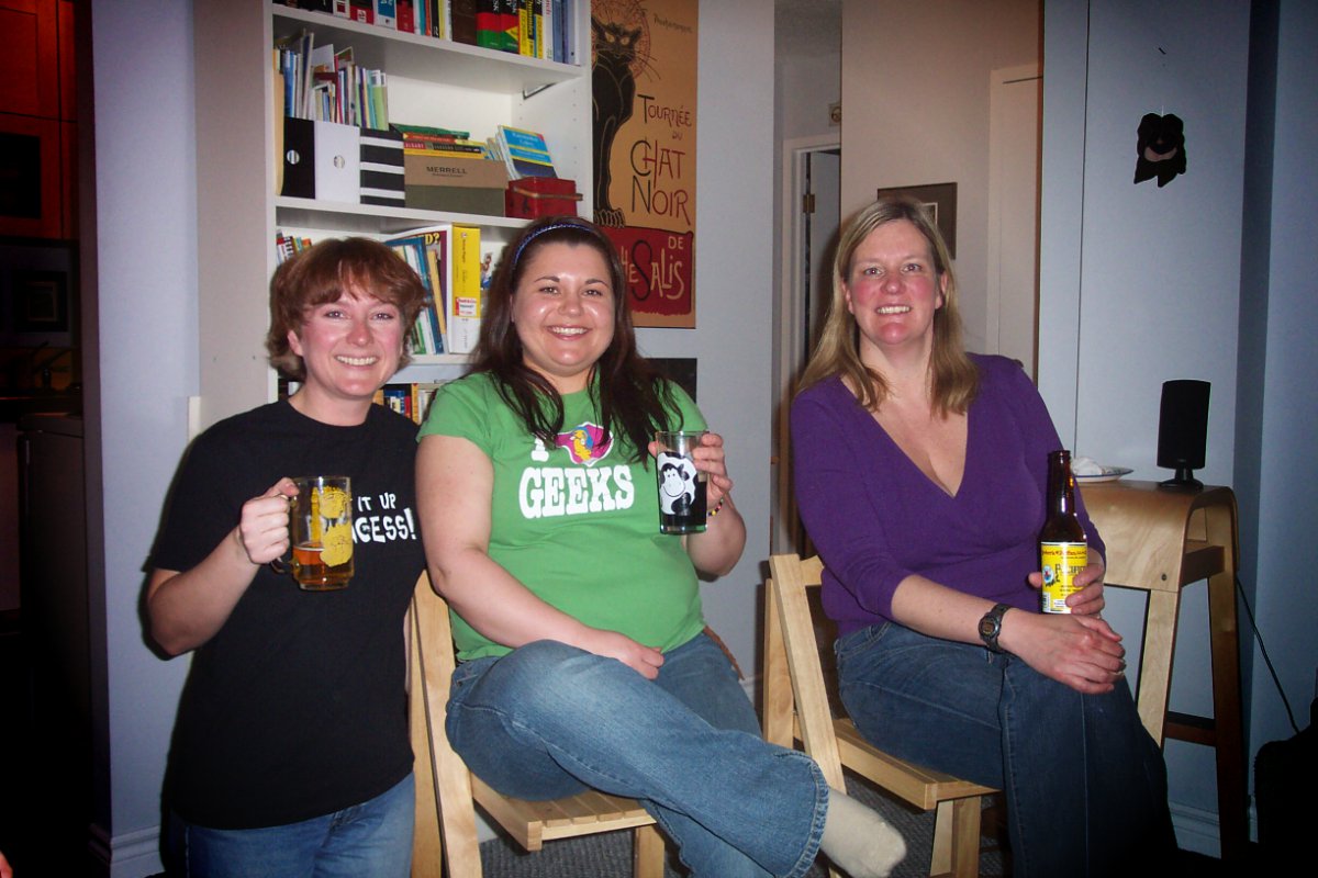 We strained (without exceeding) the capacity of my apartment this evening as thirteen of us gathered to try some different beers and munchies. Lots of interesting beers, including lots I hadn't tried before. None were yukky, but none really jumped out at me as new potential favorites, either. The most interesting was the wraspberry beer... I think that one would be an acquired taste. Ken was the only one who brought ribs, and they were from one of his favorite places in Chinatown. Those, and the brie/portobello pizza seemed to be the most popular food items. A couple of highlights of the evening for me were when a few people decided to try on my Vegas showgirl feather hat, and when Ken tried to read John's mind. Too funny.