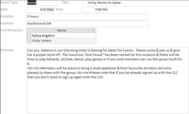 Can you believe it, our charming Vicky is leaving for Qatar for 3 years. Please come & join us & give her a proper send off. The luxurious "club house" has been rented for this occasion & there will be time to play billiards, sit/chat, dance, play games or if you wish members can use the jacuzzi built for 4. Members will be asked to bring a small appetizer & their favourite drink(no red wine please) to share with the group. Please note that if you've already signed up with the CCC that you don't need to sign up again with the COC. Vicky had a good time, enjoying a nice conversation among COC runners group plus all other CCC club members. It was great to say good bye in such a nice atmosphere. |