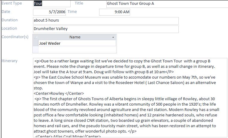In Rowley we were met by Chris and Doug, who were very nice and took us on a tour of just about the whole town. Chris led our group, while Doug went with group B. Chris was really knowledgeable about the history of the town, its restoration and use as a movie set. We were all amazed by the wonderful job done by the Rowley locals to make several of the buildings into museums. They did a heck of a job at creating some fun displays too! We ate lunch on the picnic tables, finishing just as the mosquitos found us. Group B wasn’t so lucky, as they started to eat later! We saddled up just in time to get away without much blood loss. Then down the road we went, headed through Drumheller on our way to the Atlas Coal Mine just south of East Coulee. The mine buildings were still in very good condition, and our guide gave us a very interesting and informative tour. We even got to hike up (waaaay up!) into the top of the tipple, and go on a short train ride. Then it was time to head on to our next stop, the true ghost town of Dorothy. We got to serenade each other on the way with our shiny new Kazoos, from the gift shop at the mine. (thanks Rhonda!) Not much left in Doroty but a couple of collapsing churches and some old cabins that had been restored. The locals have kept up the community hall for occasional gatherings. A couple of houses sit in the vicinity, looking to be occupied. Last stop was the tiny village of Wayne, once over 3000 people but now just a few left. Not too much there but the Rosedeer Hotel, with the Last Chance Saloon. Both Groups A and B headed in, except for a few folks who had to head home, and had a drink & some dinner. By then we were all in need of something to wash down all that ghost dust! Finally we headed out on our way back to Calgary. Rhonda had brought a mystery movie from the 1950’s for us to watch (in Marc’s posh company SUV). It was pretty corny in places, definitely worth a laugh, but kept us all watching – luckily it was over just before we reached the city. Wow, what a trip!! I think everybody enjoyed themselves – most of us want to go back & spend more time at Rowley and the Atlas Mine too. |