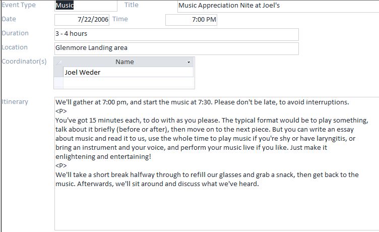 You've got 15 minutes each, to do with as you please. The typical format would be to play something, talk about it briefly (before or after), then move on to the next piece. But you can write an essay about music and read it to us, use the whole time to play music if you're shy or have laryngitis, or bring an instrument and your voice, and perform your music live if you like. Just make it enlightening and entertaining! We'll take a short break halfway through to refill our glasses and grab a snack, then get back to the music. Afterwards, we'll sit around and discuss what we've heard. |