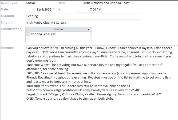 We will be providing our own DJ service (ie. me and my regular "music appreciation" attendees) for some dancing. As a special treat (for some), we will also have a few (short) open-mic opportunities for Rhonda Roasting throughout the evening. Roasters must be on the list (e-mail me to get on the list) and roasts must be kept to 2 minutes or less. If this event is full, there may still be spots available on the Calgary Outdoor Club site. Please sign up for ONLY ONE spot (ie. you don't have to sign up on both clubs). |