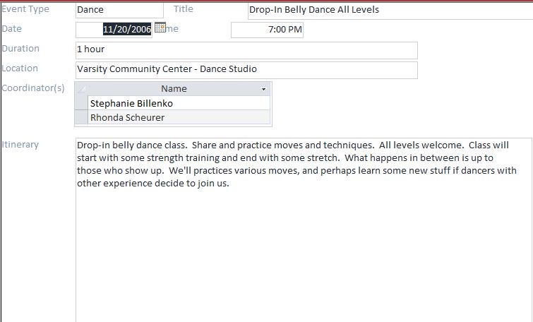 Drop-in belly dance class. Share and practice moves and techniques. All levels welcome. Class will start with some strength training and end with some stretch. What happens in between is up to those who show up. We'll practices various moves, and perhaps learn some new stuff if dancers with other experience decide to join us. |