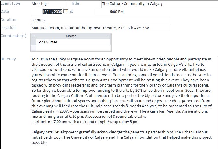 Join us in the funky Marquee Room for an opportunity to meet like-minded people and participate in the direction of the arts and culture scene in Calgary. If you are interested in Calgary's arts, like to visit cool cultural spaces, or have an opinion about what would make Calgary a more vibrant place, you will want to come out for this free event. You can bring some of your friends too – just be sure to register them on this website. Calgary Arts Development will be hosting this event. They have been tasked with providing leadership and long term planning for the vibrancy of Calgary's cultural scene. So far they’ve been able to improve funding to the arts by 20% since their inception in 2005. They are looking to the Calgary Culture Club members to be a part of the big picture and give their input for a future plan about cultural spaces and public places we all share and enjoy. The ideas generated from this evening will feed into the Cultural Space Trends & Needs Analysis, to be presented to The City of Calgary early in 2007. Appetizers will be served and there will be a cash bar. Agenda: Arrive at 6 pm, mix and mingle until 6:30 pm. A succession of 3 round table talks