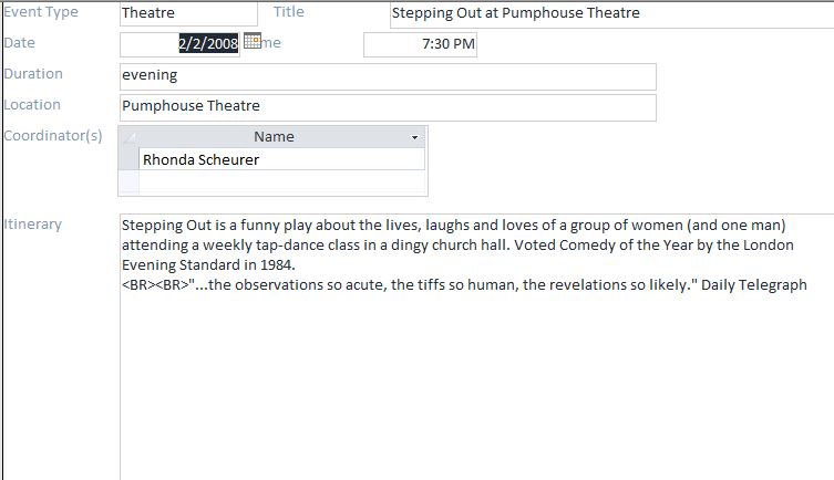 Stepping Out is a funny play about the lives, laughs and loves of a group of women (and one man) attending a weekly tap-dance class in a dingy church hall. Voted Comedy of the Year by the London Evening Standard in 1984. "...the observations so acute, the tiffs so human, the revelations so likely." Daily Telegraph When I was selecting the shows I wanted to see this season, I picked this one because of my own experiences teaching adult tap dancing classes. It didn't occur to me, however, that I would recognize one of my own students performing in the show! I taught a class in spring of 2006 and had a family sign up together - they're all performers in Calgary's amateur theatre and wanted to take some tap dancing to add to their acting resumes. Well, color me surprised to recognize the father putting his skills to good use in the show! It was a proud, proud moment for me. :) Thanks to everyone who came out to the show with me. -- Rhonda |