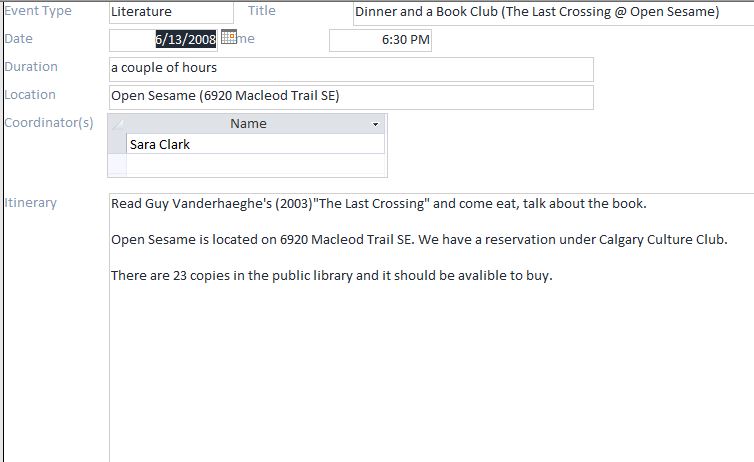 Read Guy Vanderhaeghe's (2003)"The Last Crossing" and come eat, talk about the book. Open Sesame is located on 6920 Macleod Trail SE. We have a reservation under Calgary Culture Club. There are 23 copies in the public library and it should be avalible to buy. |