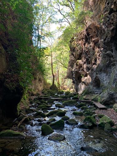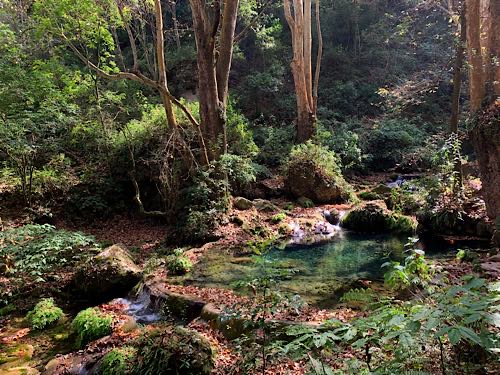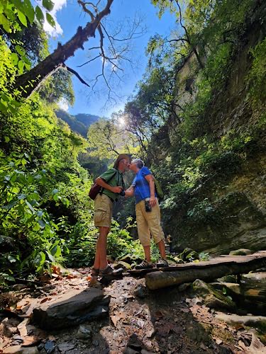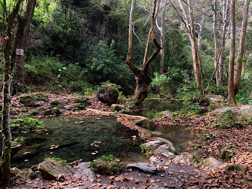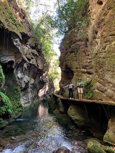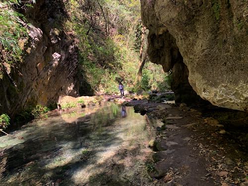 We drove the winding mountain highway into the Sierra Gorda. We saw the painting of the virgin on the hill at Camargo. Uriel says that the way the water dripped on the hill made a shape that looked like the virgin so the locals just went with it. Then we had a little stop at Pinal de Amoles, which is a really beautiful little Pueblo Magico. Our first significant stop was to hike Cañon de la Angostura, which was spectacular. To get there we turned off the highway and drove down a very long, narrow, winding gravel road. In terms of specs - distance, elevation, stream with multiple bridge crossings and a waterfall at the end - the hike is very similar to Heart Creek. In appearance, though, in feel and appearance it reminded us a little more of Plitvice in Croatia, and Walk-Behind-Falls. Next stop was a hike to the El Chuveje waterfall, which required driving out the long narrow winding gravel road back to the highway, then exiting the highway a short distance later to drive down a shorter narrow winding gravel road. The hike is shorter than the first one and Uriel and Ana sent us off by ourselves. It is a very pretty, well-developed trail through forest with a creek and some green pools, with a very tall waterfall at the end. At last we continued on to Jalpan where we had lunch at La Casita de Alex, which is owned by a friend of Uriel’s and then checked in to our AirBnB. Uriel and Ana were planning on staying over someplace rather than driving all the way back to Querétaro and they ended up checking in to the same place as us. We all went for a walk and they introduced us to Mestiza, the signature bread of Sierra Gorda which is a delightful cross between bread and a giant cookie. |