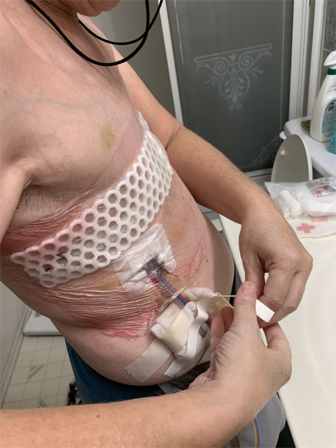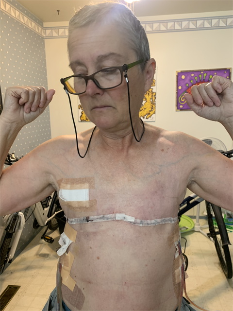 Today I was allowed to remove the outer dressing, which I did. It was kind of anticlimactic, though, because the steri-strips are still on, so I still can't see my incision/scar. Switched from around-the-neck drain holder to hip holster and diaper pins. |