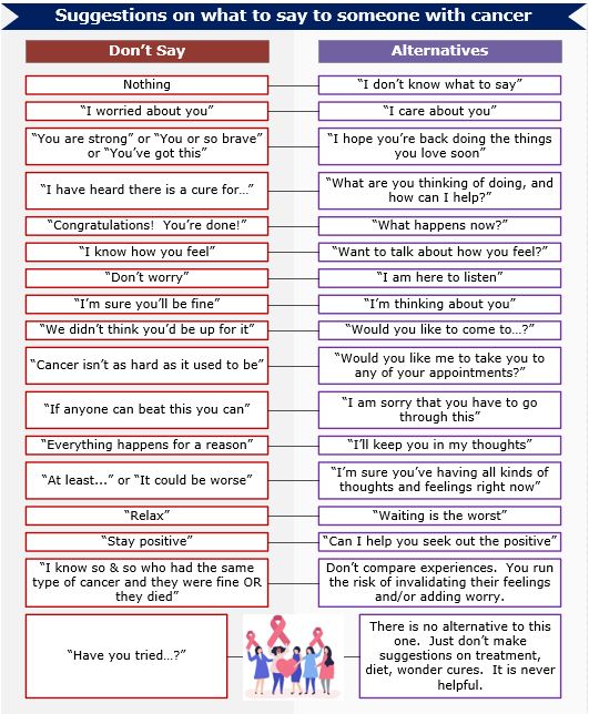 I didn't know how to interpret that I had a 4mm tumor in my lymph node. After meeting with my surgeon, I have more information, and it's not good. Generally, breast cancer tumors don't start spreading until they're over 2cm. Mine was only 1cm, so they didn't even expect a lymph tumor at all. My tumor was HER2+, which means it was aggressive. Aggressive enough, apparently, that my surgeon called me "special", and has now lined me up with a bone scan on Monday. Breast cancer that mets to bone is really bad, so I'm hoping that hasn't happened. Am I doing my best to be positive and stay on the humor train? Absolutely yes. Am I scared and sad? Also yes. I know it's hard to know what to say to someone dealing with cancer. I was struggling with that myself not that long ago. So, here's a little PSA that might help (see photo below). Also, keep in mind that if you don't know what to say to me, an inappropriate joke about my missing boobs is always a winner. Thanks for all your support. PS… random swearing is good too. |