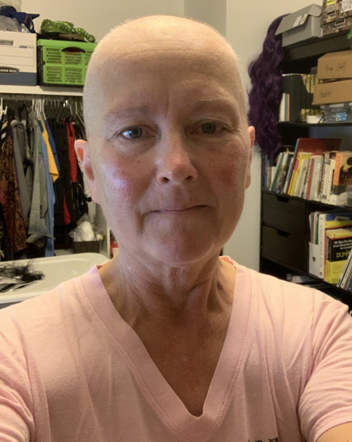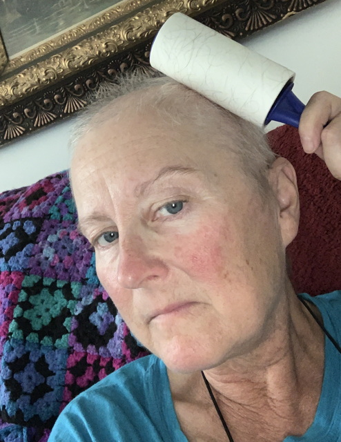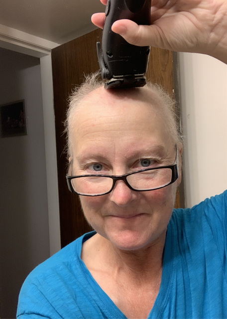 No scalp pain and minimal hair loss this chemo round, so I've declared the Hair Loss Show to be concluded. I'm tired of looking at my "baby bird hair" (thanks to my sister, Jo, for that brilliant description) and buzzed 'er off this morning. When I buzz my own hair I normally use a #2 attachment, but that was still a little too baby-bird-esque for me, so I went with a #1 this time, which leaves me close to completely bald. | |