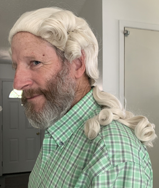 I bought a couple of fun wigs for myself, and one for Brent. He really rocks the barrister look! |