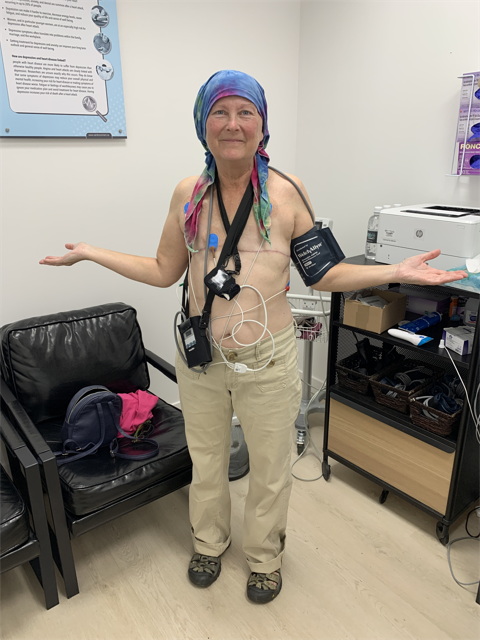 When I was told that I would get a heart monitor for 24 hours, I expected something like a single band around my chest or something. I did NOT expect 50 lbs of gear (only a slight exaggeration), including five electrodes, a blood pressure monitor that activates every 20 minutes (thankfully only once/hour from 8PM to 8AM) plus the two big recording units. My goodness. I'm glad I only have to wear this stuff for 24 hours!