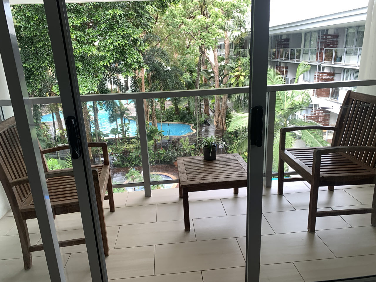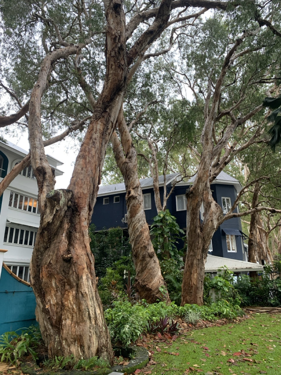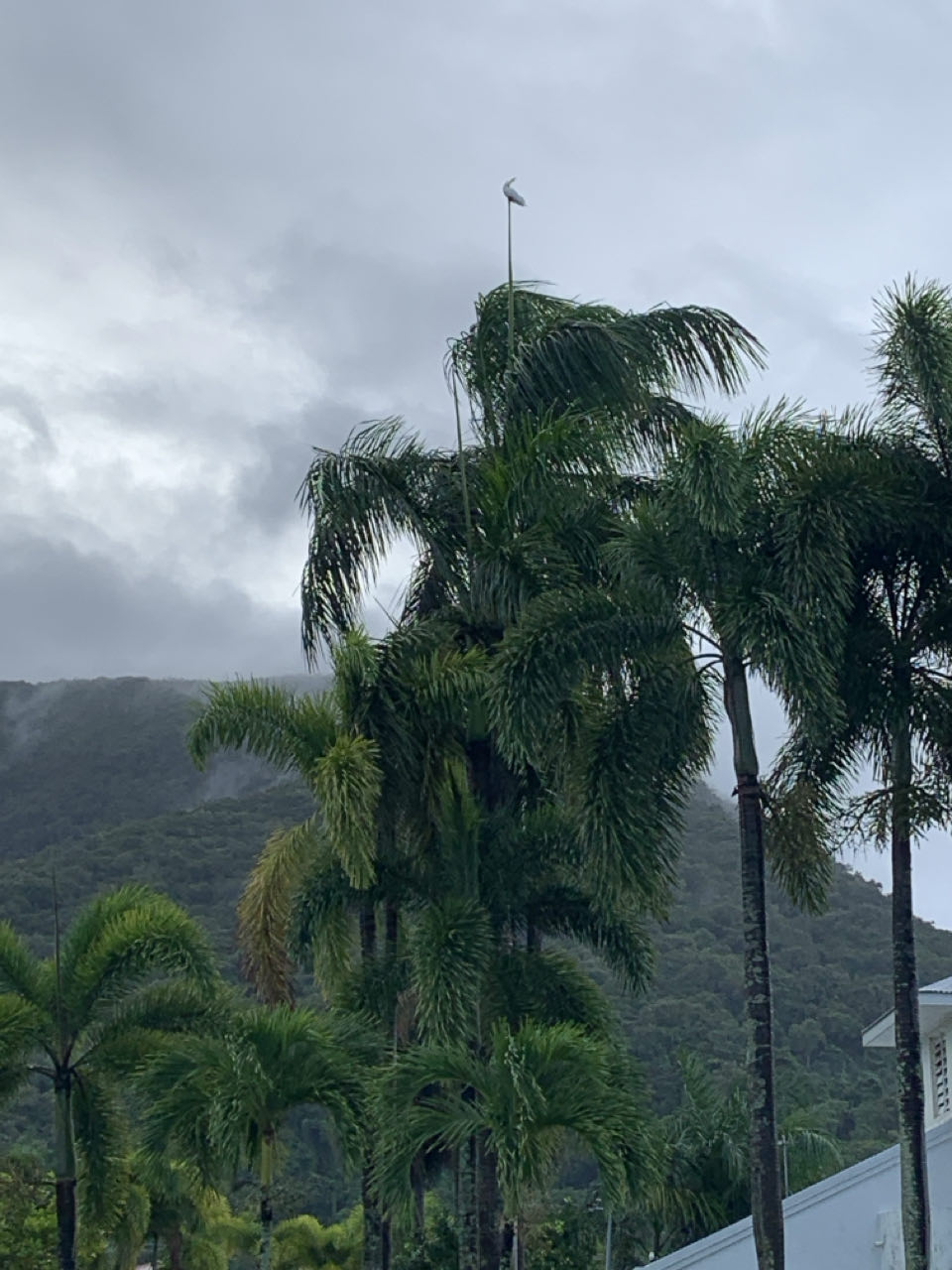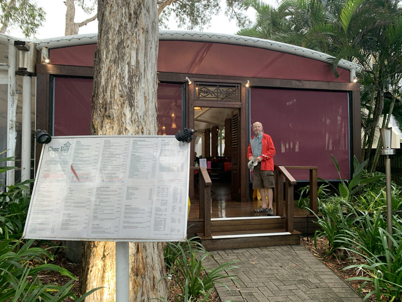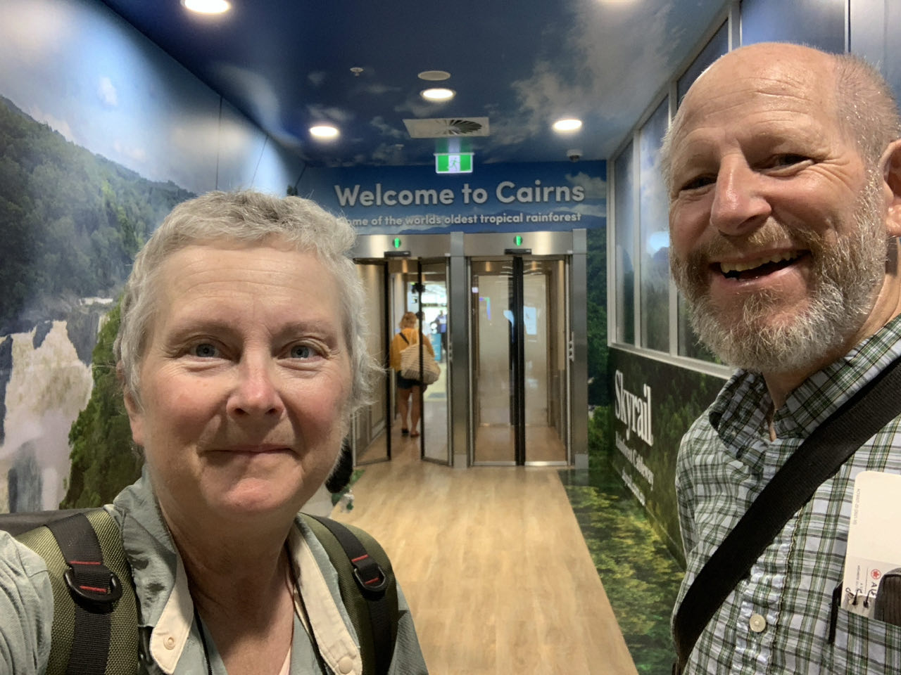 Our first stop in Palm Cove was to niece Nicole’s place. She, her husband Brion and their son, Levi, were there, along with Brent’s brother Doug and his daughter, Lisa, and the other Australian niece, Stephanie, with her husband, Diego, and their two kids, Jack and Zaya. We had a great visit with them all, and it’s so great to see how well all three nieces are doing. After a couple of hours, exhaustion pushed us on and we stopped in at the nearby convenience store (with Lisa) to provision up and then went for Thai dinner. The photos are: the view from our hotel room, the cockatoo on the tree outside of Nicole and Brion’s, Lisa posing with the camel balls, some cool spooky trees and the Thai restaurant. |