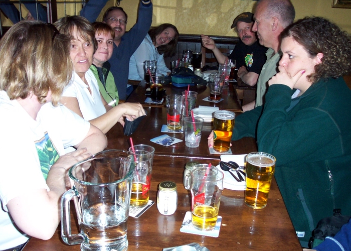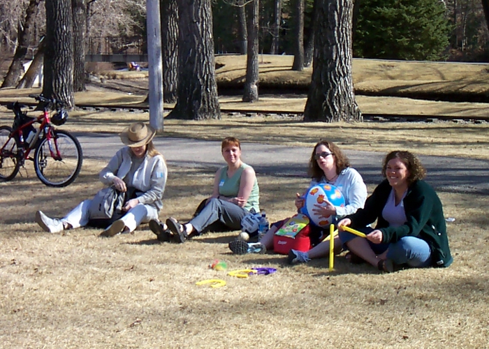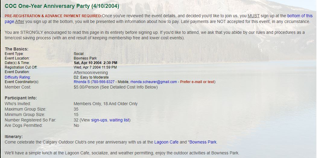 Saturday , April 10, What a beautiful day! I have a sneaking suspicion that Rhonda put in a special day order for the celebration of the first year of the Calgary Outdoor Club! Well- it worked! Umpteen people showed up at the little café in Bowness Park where a lovely setting of coloured tablecloths, nice white china and comfy chairs made a real afternoon tea setting- not to mention about 6 kinds of sandwiches, juice, all the coffee you could drink and THE CAKE- a monument to creative thought and enough for everybody!! The rest of the afternoon was spent in(order goes down according to energy expended)a very active football (soccer) scrimmage led by Brad, Scott, Merv, Allan, Ichino and Goda and badminton, frisbee, walks around the park and then those that simply lay back and enjoyed the sun and the light breeze. A lovely afternoon- felt like those lazy hazy days of summer. -- Jak One person at the event remarked that different people like different outdoor activities but everyone seems to like eating cake on a Saturday afternoon, nothing could be closer to the truth. Approx. 30 people showed up for the COC 1-year anniversary party, probably a record for one event. The merry band of gluttons converged on the "Lagoon Cafe" at 2:30PM sharp and gathered at the door waiting for their hunger to be satisfied. Once the doors opened, the crowd flowed in and demolished five plates of sandwiches and gallons of orange juice. Once the main course was consumed it was time for cake. A wonderful cake was provided with a little group of hikers drawn on the top in icing (I'm not sure which members they were supposed to be). I was put in charge of carving the cake and was forced to butcher the unfortunate little group of hikers. There were several requests for the skull cap from the guy on the left side (I was told that it was quite good). After the cake was devoured, we all headed for the field where many games were played. These included badminton (with no net), baseball (with no bat), soccer (with no goals), and Frisbee (we did have a Frisbee). The soccer game soon consumed the players from the other sports and ended with everyone losing and everyone winning (because people kept switching sides). Following the games, the most hard-core COC members had to keep the event going and headed to Kilkenny for a beer where many rousing discussions were had about subjects that I cannot write on a family type page. -- Steve I have just a few additions to the submissions already made… The playing field enthusiasts did indeed risk life and limb in the pursuit of Fun, but it must be mentioned that two particularly brave souls, Lana and Lora, took on an even greater challenge: Despite all warnings, they conquered their fears and rode the mighty rails around the park with a hearty whoo-whoo. Everyone else took one look at the engineer, shook in their athletic shoes and stepped away from the train. Regarding the die-hards at Kilkenny’s. Yes, the subject matter was at times a bit risqué for young ears. Let’s just say that we talked about philosophy and phraseology (after much foodology and boozeology). Happy belated birthday. Many happy returns… -- Cynthia |