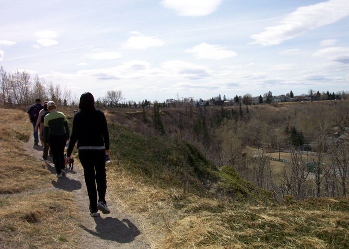 Wow! Where did this weather come from? It felt like the middle of summer out there today. This was a great little Easter hike through Calgary, including some time in parks, and some in the neighborhoods. There were a few minor up-hill sections to make us feel like we worked today, and lots of great views of the city. Kathy's little pushed-in-face dog, Ernie, provided lots of entertainment, and we truncated the end of the hike in favor of stopping at a patio on 4th St for beers. This hike started with a climb up from Roxboro to the back side of St. Mary's Cemetary. The path is heavily treed, but alas, the trees are still naked, so I've set up a couple of return trips - one for July to see it when the trees are "full", and one in September, to see it when the trees have turned colour. -- Rhonda |