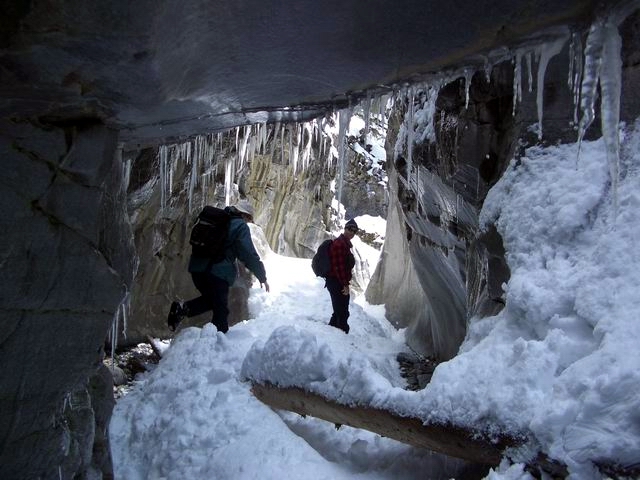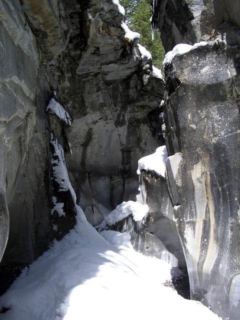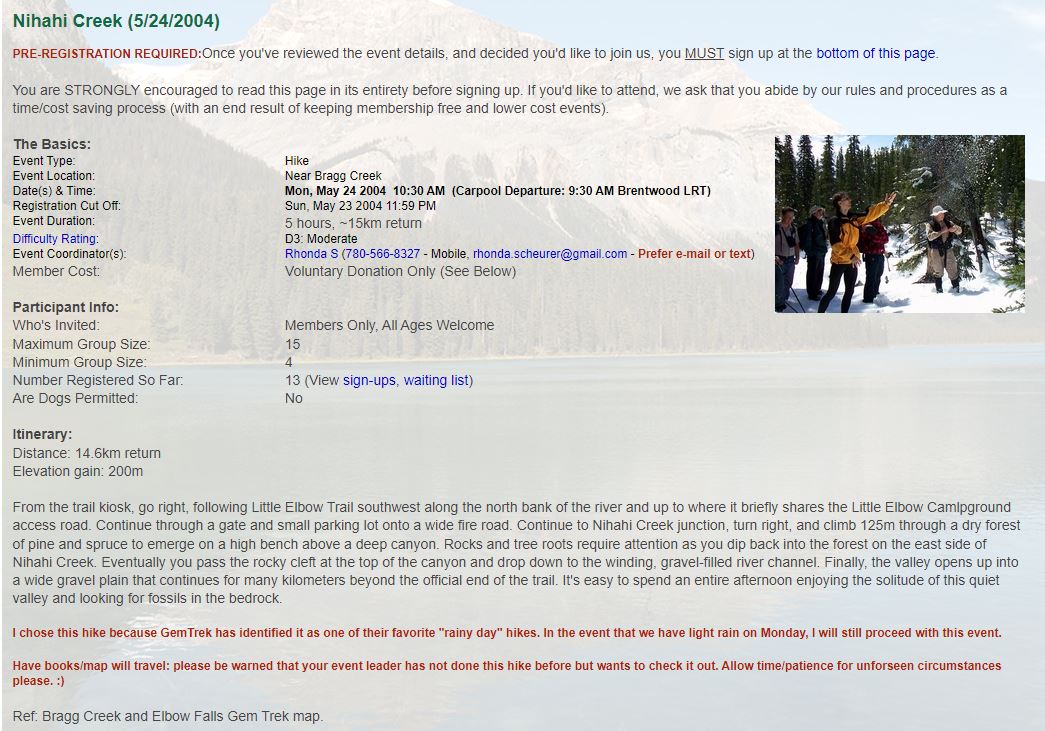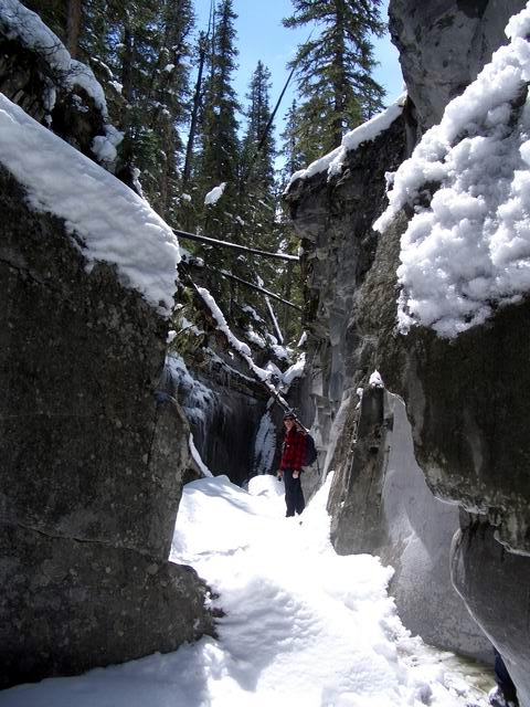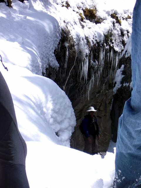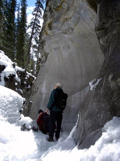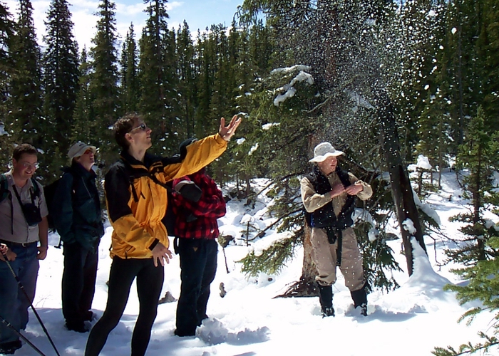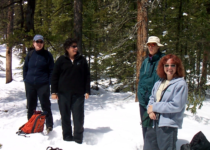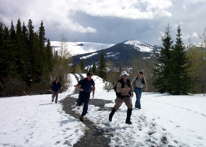An unexpected return visit from Old Man Winter today meant our usually serious and somber group had a chance to kick back and have a day-long frolic in the snow. When we arrived at the trailhead, I think we were all a bit surprised to see how much snow was out on the west end of Highway 66. Donning our shells, gaiters and senses of adventure, we set off on the trail which was somewhat mucky but mostly snowy. On up the campground road, and then the first part of the Little Elbow Trail we trudged until we reached the start of the Nihahi Creek trail. A steady switch-back climb up through the forest which spat its melting snow down on our heads, we enjoyed a couple of views of the mountains, and a surprise mini-blizzard on the way up to our lunch spot, about 2km before the end of the official trail. Invigorated from their lunch, some of the more playful members indulged in some extended snow frolic while others of us watched from a safe distance. After lunch and "play time", seven headed down into the canyon for a bit, to eventually rendezvous with the rest of us who were retracing our route down the trail. Another surprise mini-blizard in the exact same spot on the trail, and then we were out and back on the Little Elbow Trail that had become a mucky, slushy mess, which of course invited yet more shenanigans from the playfuls. Afterward, on to Kilkenny, where we were joined by Cheryl, and indulged in a stimulating game of "Telephone". A bit later, we were joined by Dave and Jon who had been out on their own adventure for the day. -- Rhonda |