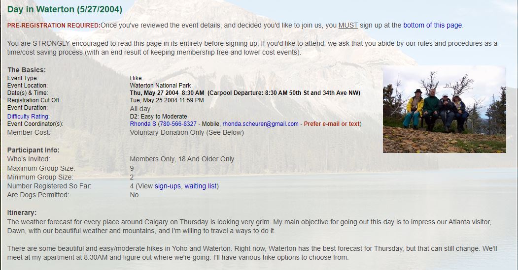 Wow - what a day we had in Waterton! With her special guest Dawn (who is webmaster of the Atlanta Outdoor Club) visiting for a bit, Rhonda led a small group (rounded out by Jacqueline and Mark) down to our most southern and perhaps, least explored national park. In a wonderfully successful attempt to avoid forecast poor weather, the group enjoyed an all but rain-free day (a brief, light shower was all that the group had to contend with), exploring 3 uniquely different and wonderfully rewarding trails in Waterton Park, where mountains seem to leap out of the prairies with little transition in the way of foothills. First the group explored the much-touted Red Rock Canyon Trail, a short loop through stratified, iron-rich sedimentary formations which produce a vivid red colouring over which a rushing mountain stream tumbles (see photos). There was a great photo opportunity at the top end of this trail, when a small herd of sheep slowly wandered through our sights. There were also other sightings of these creatures, particularly down at the trailhead when the group gathered around our fearless leader as she lectured them on matters of etiquette and how good sheep ought to behave (see photos). Heading off from the same trailhead, the group then explored the Blakiston Falls Trail where there were some wonderful photo ops and several viewpoints of the falls and Blakiston Creek. Wildflowers were in abundance, especially Glacier Lily. Last on the hiking trails was the more arduous but still manageable Bertha Falls Trail which starts in the Waterton town site and affords an incredible view of Upper Waterton Lake, the town site and especially, the Prince of Wales Hotel (built in 1927). There was also another great stop at Cameron Falls (see photos) in the town site and a much-enjoyed drive along the scenic Highway 22, which parallels the mountains, affording views not possible from the Highway 2 route. An intriguing feature down around Highway 3 was the presence of numerous electrical power-generating windmills, lined up along the ridges (see photos). A long day but well worth it, and highly recommended to others! Looking forward to the camping/hiking weekend later in the season. -- Mark |