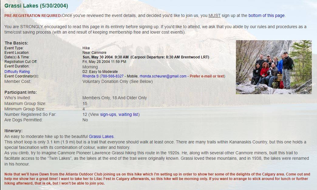 Well, another spectacular but short hike to Grassi Lakes for COC members Rhonda, Dawn (Rhonda's guest visiting from Atlanta Outdoor Club), Bridget, Ray, Rosemarie, Jacqueline, Jennifer, Mark, Doug, Parry, Jorge and Merv. The trailhead for Grassi Lakes is found right up behind the town of Canmore, opposite the Nordic Centre. There are two ways up the trail - the 'easy' route follows an old fire road and, as our fearless leader most correctly identified, it is boring! The more difficult (but very scenic!) route is highly recommended as the preferred route for both the ascent and descent for this short, 3.1 km loop (with a fairly modest elevation gain). Along the way, the Calypso Orchid can be found, though it's early yet for them at this location. Proceeding further up the trail are some wonderful views of a spectacular waterfall cascading down from the Grassi Lakes outflow (see photos). Continuing on over a steeper portion, the trail takes the form of a stone 'staircase', modeled after the original stonework done by Lawrence Grassi, for whom the lakes are named. Crossing a small bridge near the top, soon appears the first of the 2 Grassi Lakes, each of which display the most vivid, surreal colours which change constantly with the sunlight and the surface disturbance from the wind! Only a few metres further on is the second lake, distinctly different from the first. Further up the trail above this lake are Indian petroglyphs (see photos) estimated to be a 1000 years old! Also above this lake, rock climbers were out in abundance (see photos), practicing rappelling down the sheer cliff face. Upon returning to the parking lot one member of the group (Bridget) , seeking respite from the car companions she'd traveled up with (Rhonda and Dawn!), asked if she could join another group for the return ride and once she'd safely retrieved her belongings from the other car, amused her travelling companions on the way back, with amazing anecdotes about our fearless Club President, the most embarrassing moment stories etc.! As a final note, rumour has it that our American guest, Dawn, was seeking political asylum/refuge status and was not wanting to return home to Atlanta! Welcome to Canada Dawn! Pretty interesting people here, eh? -- Mark |