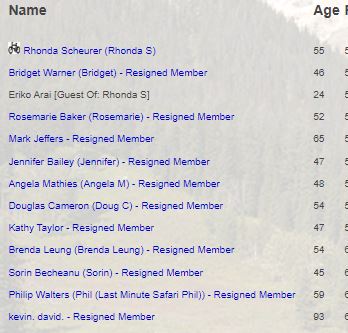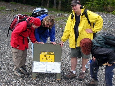 Well, the rain gods were not smiling on our group, and the suggestion to sacrifice a young virgin to appease them was rejected, as this writer was considered too old and there were no other virgins in the group. The rain continued throughout most of the trip with teasing moments of sunshine peering through once or twice, having group members lining up to worship this welcome event! Nonetheless, despite the dampened clothing and the need for emergency blister first aid for one member (who declined the offer to have her appendix removed at the same time!), the hike was an enjoyable event and spirits remained undampened. Our fearless leader Rhonda, kept egging us on, insisting that according to her GPS, we had not moved in the 3 hours since her last reading! There was also some dispute as to whether or not the posted distance (16.6 km) was accurate as we felt we kept up a steady pace for most of the 6 hour duration of the hike. As some of the 'mice' appeared to tire during the course of this event, Rhonda kept pulling out little bits of cheese, holding them just out of reach in an effort to keep certain members moving. One member attempted to clear the trail of deadfall trees (there were many!) for the benefit of others, but misunderstood the offered suggestion of 'use your head!'. No harm was done, as evidently there was nothing up there to be harmed. The 'fast' group (lead by Phillip) made the circuit more than an hour before the 'slow' group (Rhonda kept stopping to take pictures and begging for more cheese!) but forgot to take any car keys with them. Kevin, (from the fast group) made Phillip jog back with him 4 km (rumour is that Kevin carried him!) just to get a little exercise. Then, just before the end of the trail, the group discovered a sign (see photos) which to their consternation, adivsed that there was a bear in the area! One member (to remain anonymous) shrieked "There's f#*^&$# bears out here???!!" but after we calmed Rhonda down and reminded her that she was the only one carrying bear spray, she seemed to be alright. Meanwhile, Kevin, wanting a little more exercise, had completed 14 more loops of the lake. All in all, a rather uneventful and still enjoyable trip. (Note: not all of the information in some of these reports is necessarily entirely factual.). -- Mark the prevaricator |