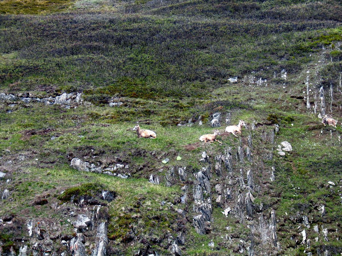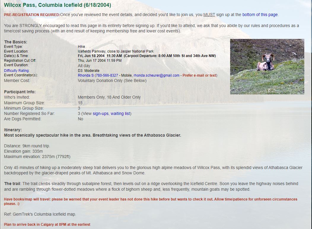 Bright and early, Kevin, Jacqueline and I set out in the Fozz-Meister (aka Fozzie, aka my Ford Festiva). Our constant chatter became a reverent silence (punctuated only by the occasional “oooooh” and “aaaaahhhhhhh”) once we turned north onto the Icefields Parkway with the eye-popping mountains and spectacular blue sky. Wilcox Pass is a great little hike up through light forest which opens up quickly into scrubby parkland. Past the roaring stream we found oodles of bighorn sheep with REALLY BIG HORNS (coincidence? I think not…). A bit more elevation gain and we made it into the meadows of Wilcox Pass. We trekked further into the pass, for a total of about 5.5km in, where we learned and practiced many new skills, including runoff stream fording, snowbank traverseing, marsh hopping, tundra whacking and runoff-stream-fording-and-snowbank-traverseing-and-marsh-hopping-while-tundra-whacking. Once we reached the food court (aka the picnic table and public washroom, aka a few rocks and a little bump of a hill that obscured the lunchers’ view while essential business was conducted), we stopped for lunch where some candid photos were snapped of Kevin and I while we ate (grrrrreat… can’t WAIT to see those ones….). Returning the way we came, we encountered no more sheep, but plenty of chubby gophers and a few humans in search of the sheep. Back down the Icefields Parkway with more reverent silence (punctuated only by the occasional snore… thankfully NOT from the driver), and approaching Lake Louise, Kevin and Jacqueline were overcome with joy to listen to my Disco CD at ¾ volume which was required to stave off the highway hypnosis that was setting in. -- Rhonda PS… Thanks to Jak and Kevin for taking pictures today, since somebody (use process of elimination) forgot her camera and GPS at home... |