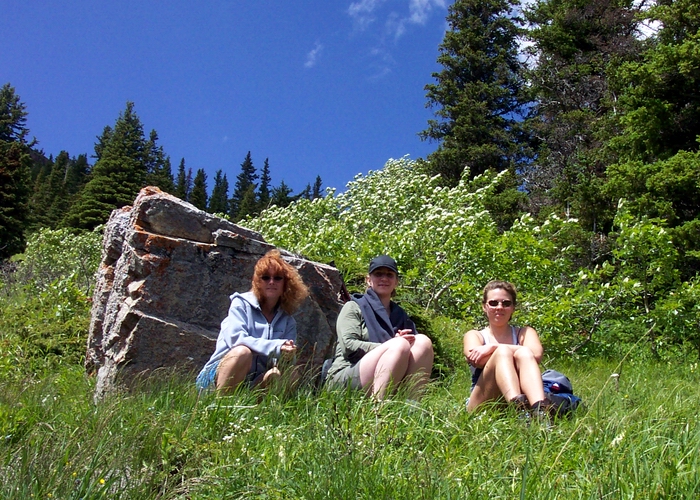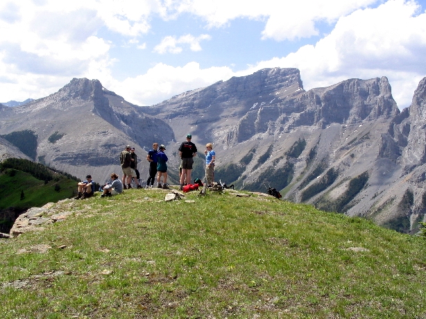 At long last we got some brilliant blue skies today befitting of the Alberta summer. It was a beautiful and warm day – perfect for hiking. Wind Ridge is approximately 750m of gain over approximately 7.5km… problem is, most of it is right at the very end. By the time we’d hiked in about 4km, we’d only gained about 2½m of elevation. Then, the trail started getting steeper… and steeper… and steeper yet. Due to a severe case of Acrophobia, one hiker had to turn back early, with her understanding pal in tow. Not too long after, the fainter of heart on the trip declared the 6.5km/550m gain point as the “summit” where they relaxed and enjoyed their lunch in blissful denial of their lack of reaching the true summit. The ten true adventurers continued on up… and up… and up… some reaching the top by climbing the rock face, and three explorers choosing the bushwhacking “go around the side of the rock face” extended route, which, we will take their word for it, was a lovely diversion with excellent views. Rendezvousing back at the cars, we realized that we were one hiker short, and were just about to send out the search dogs, when the previously “nice sane guy” Marcel re-joined the group from the other direction with a wild and haunted expression. We haven’t yet discovered what happened to him, but alien abduction has not been ruled out. Since the club is unable to spring for counselling, we are requesting donations be dropped in the form of large cash bills in the COC name at Kilkenny Pub until we’re able to come up with enough for some proper care… or at least a straight-jacket that we can put him in for a photo shoot. -- Rhonda |