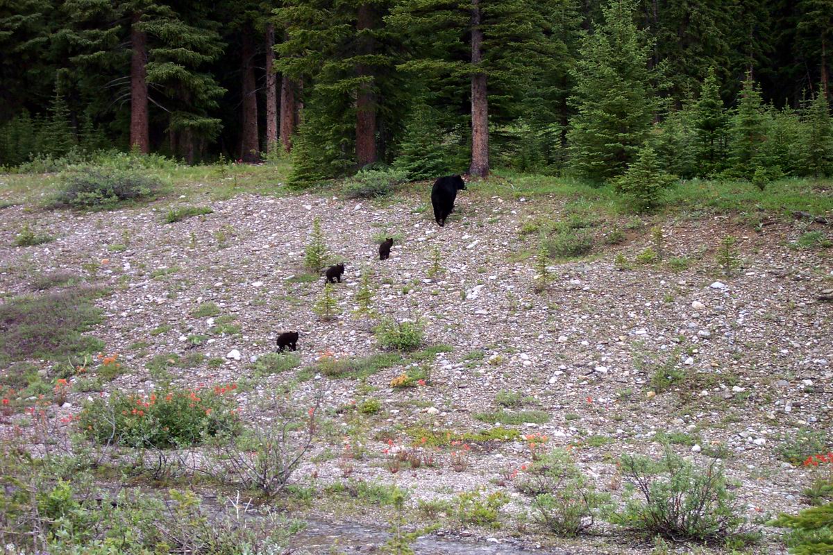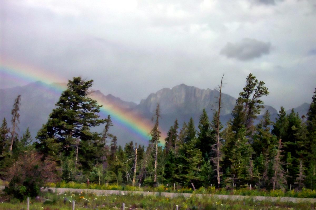 The six of us leaving from Calgary met promptly and set out eagerly with our crampons, harnesses and helmets. Far, far away, we drove. Two unfortunate souls who were to hook up with us along the way had to bail early due to Westie problems at Mosquito Creek. The rest of us (in three vehicles, due to carpool complications) rendezvoused up at the Columbia Icefield where the event was called on account of rain/sleet and lightning strikes (not a great time to be out on a glacier). Four of the disappointed rendezvoused at the coffee shop in Louise, while two boneheads missed the turnoff and didn't realize what they'd done until they were almost at Banff. D'oh! All returned to Calgary in their respective vehicles, hopeful to try the trip again in August. Highlights of the trip (from the Cheryl and Rhonda car) included a brilliant rainbow near Canmore, a mama bear with THREE cubs crossing the Icefields Parkway on the way up, and a big ol' moose parading around on the side of the Icefields Parkway on the way down. Yes, I am aware that the photo in the album is of an ELK. That photo is from Mehran and Debbie's car... we didn't manage to get a pic of the MOOSE. Good conversation (yakking) in the truck, plus a wolfed down lunch at Joe Btfsplk's in Banff (where the yakking actually ceased for approximately 3 1/2 minutes while said lunch was inhaled) rounded out the day. -- Rhonda |