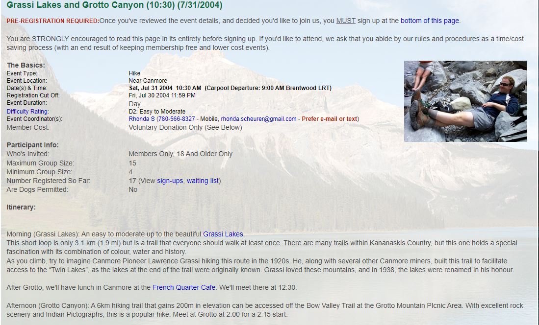 A great day. Grassi Lakes was beautiful. The food at the French Quarter Cafe was Cajun. Grotto Canyon was spectacular. Followed up by a rendezvous at the Kilkenny with Mark and Dave's event groups. For a much better write-up, see the one from Mark's group who did the same hikes as us this day. -- Rhonda PS... Grotto Canyon is NOT to be missed in the winter, and while I'm thinking about it, ditto for Heart Creek and Johnston Canyon. See last winter's hikes: Grotto Canyon: Mar 20, 2004, Jan 10, 2004 Heart Creek (same as Grotto Canyon Jan 10... it's the one with the bridges). Johnston Canyon: Feb 8, 2004, Jan 4, 2004 Or sign up for this winter's coming events: Grotto Canyon: Jan 13, 2005, Feb 12, 2005, Mar 5, 2005 Heart Creek: Jan 18, 2005, Mar 3, 2005 Johnston Canyon: Jan 9, 2005, Feb 26, 2005 |