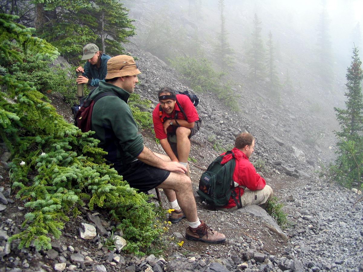 Today, Pooh (Stuart) brought out two Leors with him. Now, without getting too sidetracked, I would just like to ask, WHO THE HECK KNOWS TWO GUYS NAMED LEOR!!?? Well, I guess, now I do. Anyway, Pooh brought two Leors with him, but no Tiggers, Roos or Piglets. The fog was so thick today that we never did figure out for sure if we were on Mount Yamnuska, or in Wal Mart. The greeter in the blue vest did nothing to calm our fears about the latter. So, perhaps it was the fog, but I would have to say that the views from Yamnuska are slightly overrated. Susan said it looked way better if you closed your eyes and remembered what it looked like last time you were up, but that didn't really help me at all. We hiked up the east side of the mountain, where some of the group decided to try for the summit. They never found it, but they did find Steve's group at one point. The rest of us went straight out to begin traversing the base of the cliff in search of the famous scree slope which is a "must run down" highlight of the Canadian Rockies. We overshot the scree, and at one point our group of six accidentally went off trail and onto a really treacherous (IMHO) slippery clay slope which freaked a few of us out pretty good. Mehran, on the other hand, trooped across it as thought it was his living room carpet. One good thing about overshooting the scree is that we were eventually joined by the "fast group" who had left Steve's group and come back around to join us. When we realized that we'd overshot the scree, we turned back, taking a lower trail and bypassing the stupid clay that tried to fling me into the abyss. Soon, the "fast group" (aka The Sarcastic Four, aka The Flying Rappeler, The Human Slide, Monkey See and The Group Wife... sorry Jana) decided that to heck with finding the 'official' scree slope... here was a slope, and it was scree, and off they went running down it while the rest of us sensibly carried on to where we found the good scree slope. For the record, YES, the Scree Slope Rocks, And YES, you MUST run down it once in your life! We ran down the slope, and at the end, five hearty souls decided to run down a little bit MORE scree that didn't look very run-able to myself, Susan and Mehran. I do believe this was the first time in my life I was the first one back from a hike. Mehran, Susan and I made it back to the cars first, joined soon after by Cam, Tanya, Stuart and The Leors. As we waited for the "fast group", pondering exactly how long we had to wait before we could just say screw it and head for the pub, they were bushwhacking their way back from their inferior scree slope (although they seemed to enjoy it), and, I understand Jana stopped once to don some lip gloss so she'd look good for the helicopter rescue guys when they showed up. Soon, Ray called in on the radio to confess that they were lost, at which point I held up my radio as everyone at the parking lot laughed their guts out. Once we settled down, we told them where they were and how to get back to the parking lot (they were only 10 minutes away at the quarry). With everyone safely returned (I find it terribly amusing that all three groups returning took the wrong turn that brought them out at the quarry), we headed off to the Kilkenny, where we saw Dave's group (Stanley Glacier), Steve's group (earlier Yamnuska trip), and Cheryl brought her son, Aaron, in to say 'hi' on his visit to Calgary. -- Rhonda |