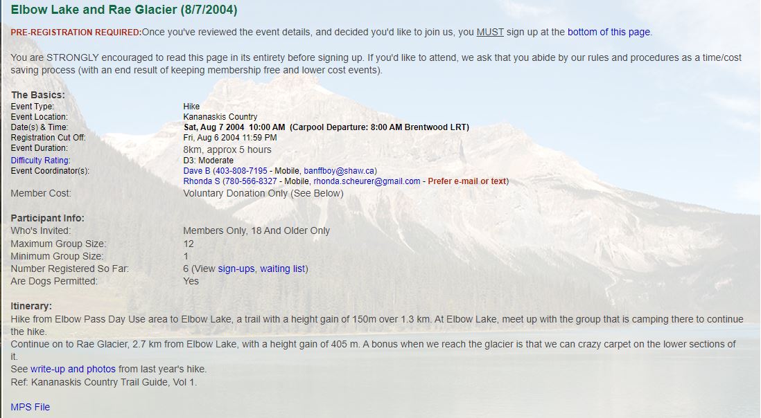 Nope, we didn't go to Elbow Lake and Rae Glacier. It was raining all over the mountains this morning when I got up (at 5:30), but clear in Calgary, so being the flexible event coordinator that I am, I figured we'd go on an urban hike, probably Bowmont Park, and if everyone was into it, hit the Kilkenny breakfast buffet first. Well, naturally, by carpool time (8:00), Calgary was socked in, too, so I was officially out of ideas. When I got to carpool, though, Dave saved the day with a suggestion of heading out to Cave and Basin in Banff and doing the Sundance Canyon hike, weather permitting, and weather NOT permitting, we would just check out Cave and Basin. So, like Mark's group, we headed out to Canmore for coffee and to decide whether to continue west. After a lovely coffee at Infuso, we decided that we would, indeed, carry on, and headed out into Banff, where we were greeted with cloudy (but otherwise dry) skies. We did the Sundance Canyon hike (about 9km return) and then returned to Cave and Basin where Chris opened up her bottomless daypack and pulled out a snack buffet spread to rival my river float buffet. After munchies, on to Cave and Basin, where we smelled (and saw) the stinky sulphur hot springs, saw the various and sundry plants and animals that thrive in said stinky sulphur hot springs (including the snails, and a bunch of mosquito fish, and one fishy that looked like all the others but with some flourescent blue coloring on its tail (well, the water is slightly radioactive, after all), and didn't find any ice cream at all. -- Rhonda |