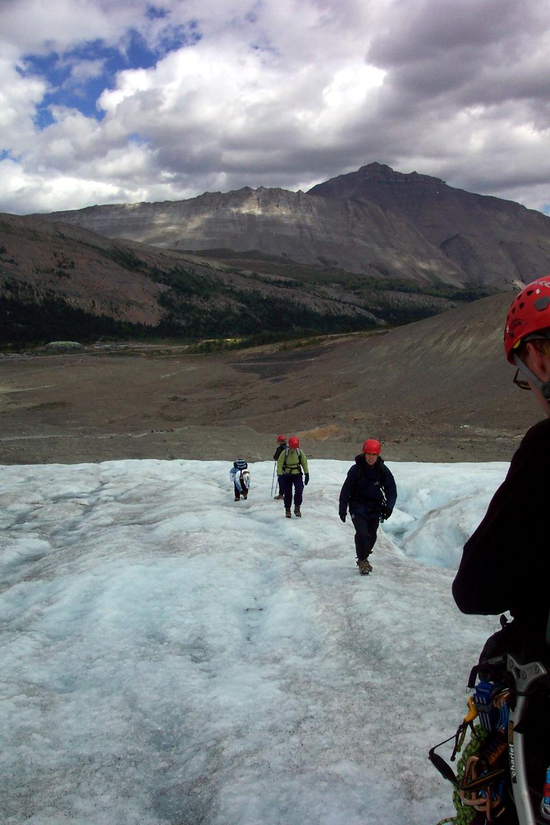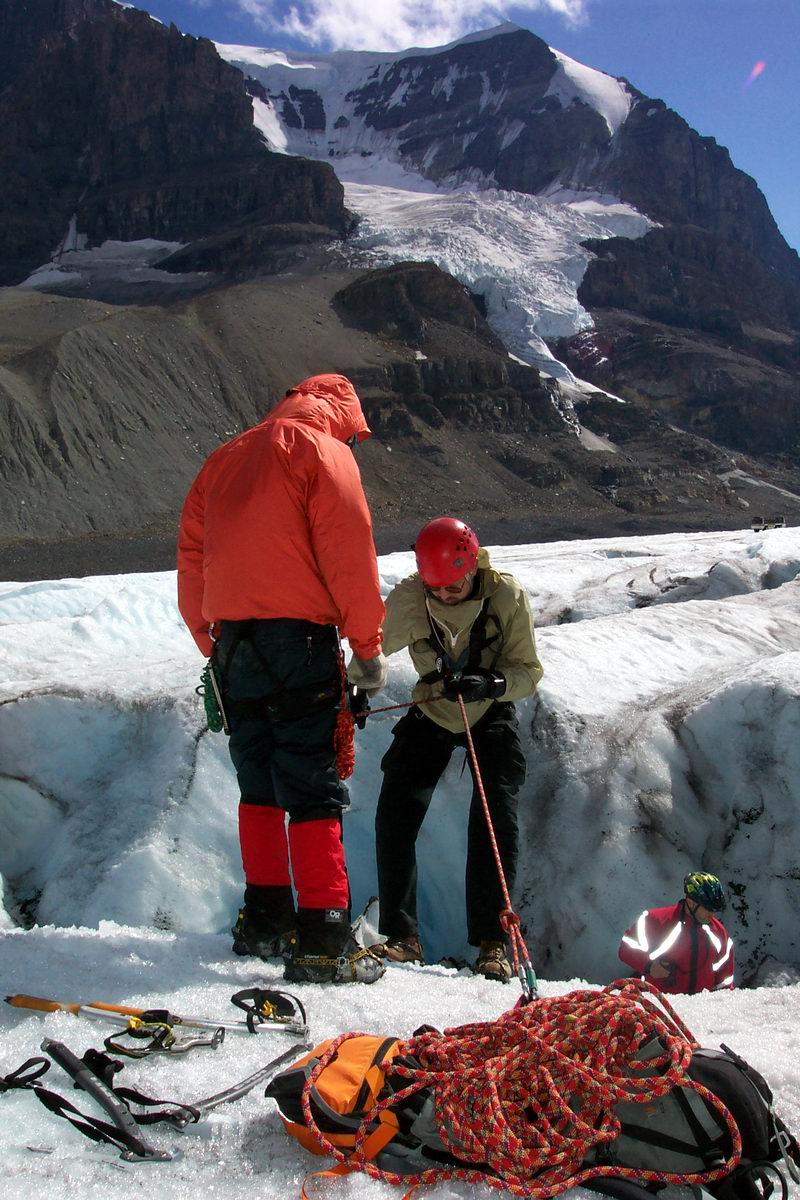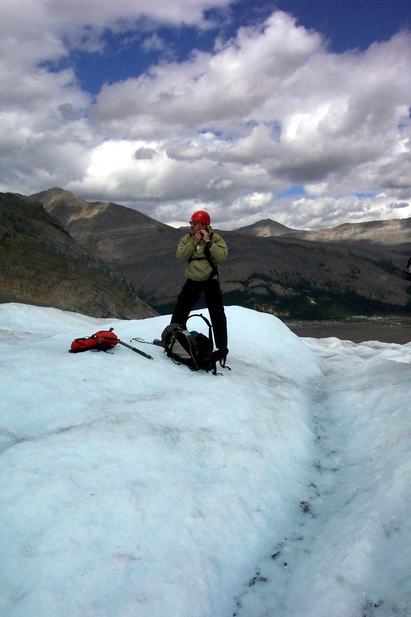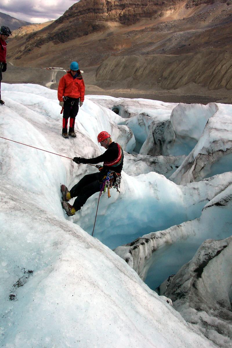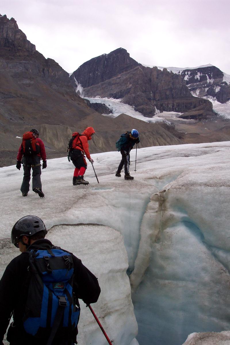 Some of the group came in from camping in Jasper to rendezvous with the rest of the folks coming in from Calgary. Kate, who was camping from yesterday's event was along for the ride home and had to wait for us while we did the ice hike. We recommended that she do Wilcox Pass hike, but she never made it to the trailhead, in spite of her valient attempts at hitchhiking the couple kms down the highway (perhaps next time she'll heed my advice and show some leg). The rest of us did an equipment check at the parking lot, and then we walked up the trail to the toe of the glacier. As we donned our equipment (harnesses, helmets and crampons), we discovered a grave problem with Dusan's crampons and woefully, he was sent away to try to catch up with Kate, or otherwise amuse himself for the day. The remaining eleven hiked up the toe of the Athabasca Glacier, and received some basic instructions on walking on the glacier with our crampons. Up and up we went, beyond the point where the 'official' walkway is on the ice that Parks has set up for public use. We passed the Snocoach base, and proceeded beyond the marker pole to where we found a most spectacular crevasse. Dave scouted out the crevasses for us while the rest of us ooh'd, ahhhh'd, and photographed what we could see from the top. We played in "our" crevasse for the rest of our time on the glacier, exploring from the top, walking down from the side, and (almost) everyone rappelling down into the wet dirty ice cavern. A quick hike down and a look at another smaller crevasse, and then we joined onto the 'official' walkway, turning the heads of all the tourists sliding around on the glacier in their runners, sandals and shorts. At the bottom, one man approached to get his photo taken with a "mountain man", and first Mehraniac, and then Dave, were happy to oblige. Some Asian ladies with pink boas for scarves then accosted Rhonda to videotape her crampons. Back at the parking lot, Dusan and Kate rendezvoused with the group for the 'important' parts of the day: Hot Chocolate at the Icefield Center, and then dinner in Banff. -- Rhonda |