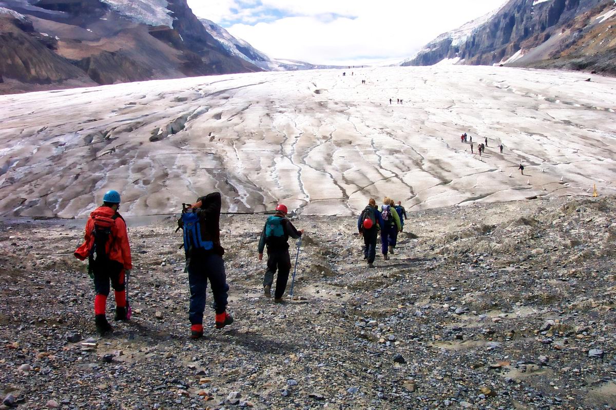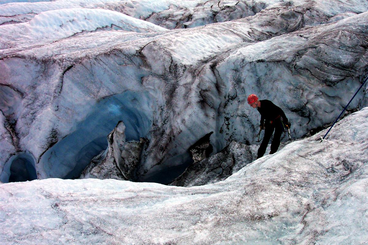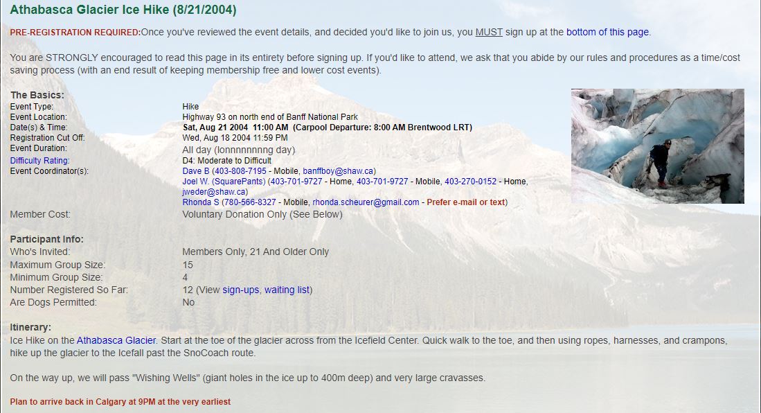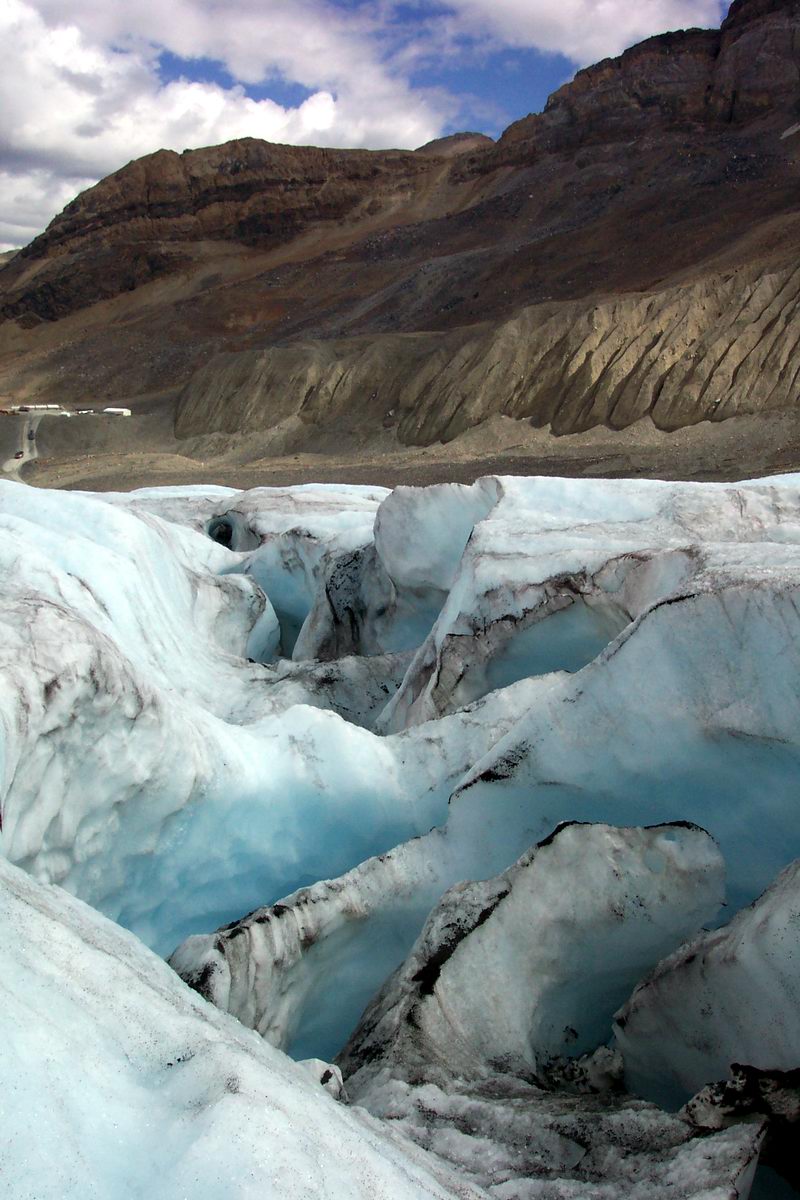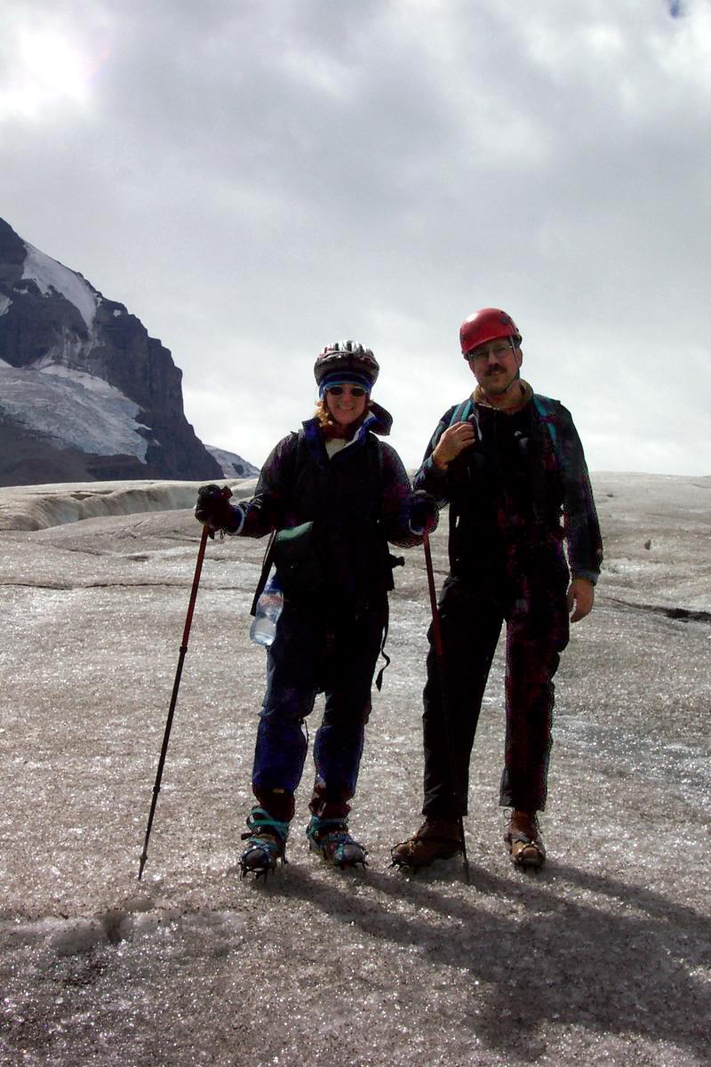 Some of the group came in from camping in Jasper to rendezvous with the rest of the folks coming in from Calgary. Kate, who was camping from yesterday's event was along for the ride home and had to wait for us while we did the ice hike. We recommended that she do Wilcox Pass hike, but she never made it to the trailhead, in spite of her valient attempts at hitchhiking the couple kms down the highway (perhaps next time she'll heed my advice and show some leg). The rest of us did an equipment check at the parking lot, and then we walked up the trail to the toe of the glacier. As we donned our equipment (harnesses, helmets and crampons), we discovered a grave problem with Dusan's crampons and woefully, he was sent away to try to catch up with Kate, or otherwise amuse himself for the day. The remaining eleven hiked up the toe of the Athabasca Glacier, and received some basic instructions on walking on the glacier with our crampons. Up and up we went, beyond the point where the 'official' walkway is on the ice that Parks has set up for public use. We passed the Snocoach base, and proceeded beyond the marker pole to where we found a most spectacular crevasse. Dave scouted out the crevasses for us while the rest of us ooh'd, ahhhh'd, and photographed what we could see from the top. We played in "our" crevasse for the rest of our time on the glacier, exploring from the top, walking down from the side, and (almost) everyone rappelling down into the wet dirty ice cavern. A quick hike down and a look at another smaller crevasse, and then we joined onto the 'official' walkway, turning the heads of all the tourists sliding around on the glacier in their runners, sandals and shorts. At the bottom, one man approached to get his photo taken with a "mountain man", and first Mehraniac, and then Dave, were happy to oblige. Some Asian ladies with pink boas for scarves then accosted Rhonda to videotape her crampons. Back at the parking lot, Dusan and Kate rendezvoused with the group for the 'important' parts of the day: Hot Chocolate at the Icefield Center, and then dinner in Banff. -- Rhonda |