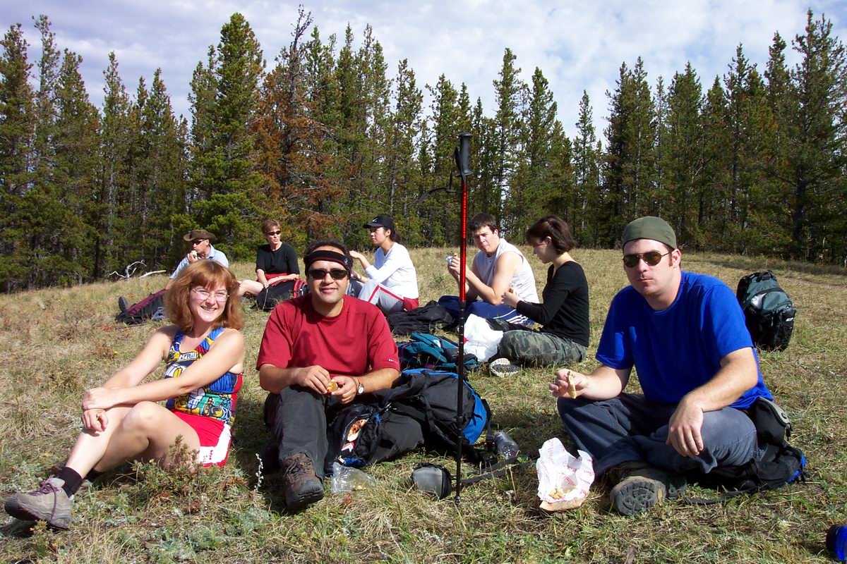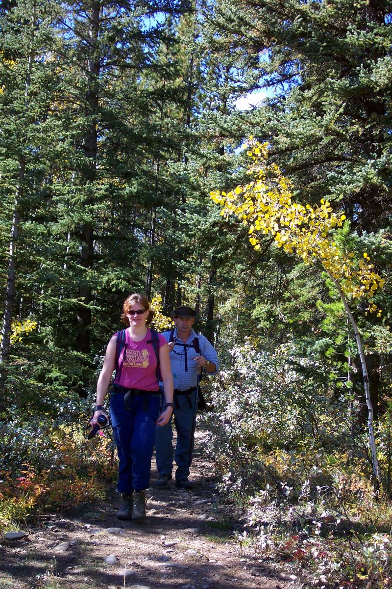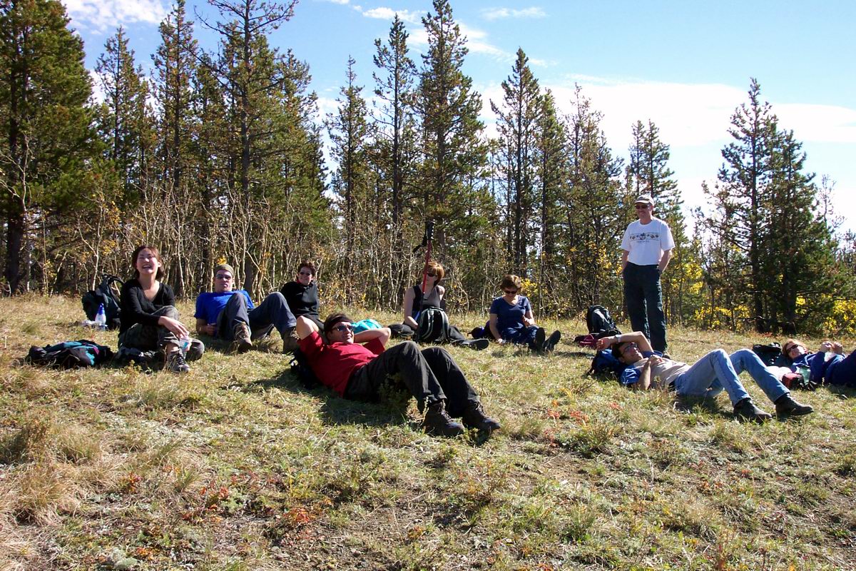 Has summer finally arrived? It would almost seem so as we hiked on this beautiful fall day in 20C weather! This was a very nice fall hike, with lots of pretty colourful trees. The big thrill came when Debbie used her wildflower book to identify a flower at lunch time! Wow! After lunch, we headed down the hill to the intersection with the Elbow Valley trail, which is where Petar joined us having shown up late for Joel's trip. The big scare came when we forgot to wait for our stragglers at a confusing intersection and they managed to walk quite a ways down the trail in the wrong direction before our hero, Alastair, saved the day by running after them and finding them. Finally, the big stink came when the Poo Shoe Sisters stepped in some especially stinky poo, with Jacqueline taking the plunge first, and woeful Karen following shortly after (and also after severe mockery of Jacqueline). People who live in glass houses...