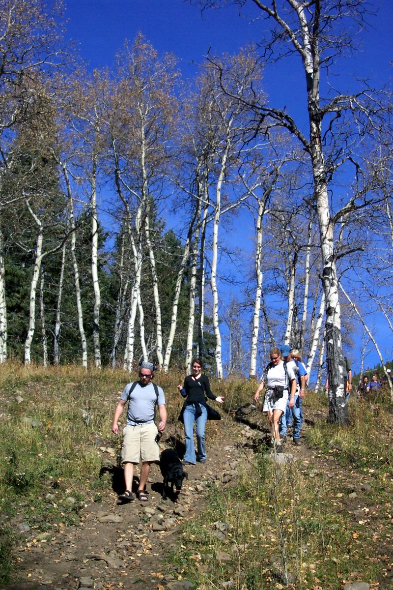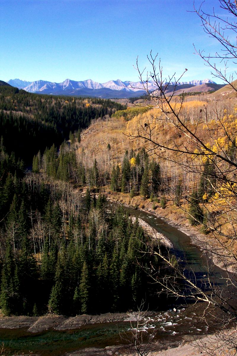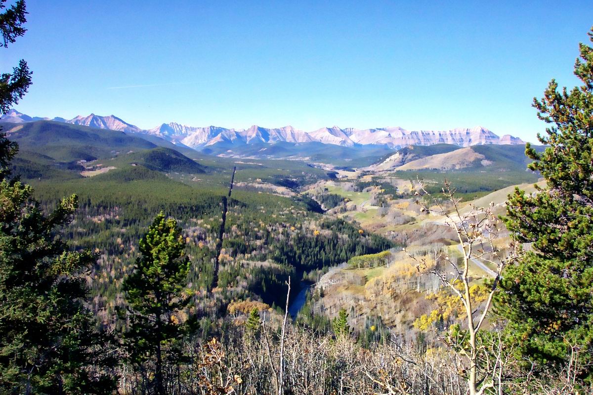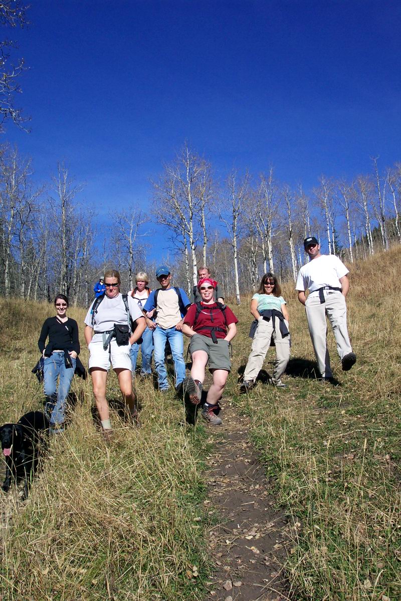 Due to a miscalculation on the part of the trip coordinator, most of us ended up at the trailhead a half hour early. Normally, this would probably be a good thing, but given that we were meeting three people AT the trailhead, and they would be arriving at the correct time, we had to kill 30 minutes. We went and noodled around on the end of the trail, where we found lots of cows. Noisy ones. By the time our whole group was assembled, Cam's group was starting to arrive, so they were in the same situation as us. They gave us a fifteen minute lead, and we set off. It took no time at all before we were shedding layers - it went up to 20 today, and it was balmy! On we trekked until the views started opening up onto Windy Point Ridge, and then down the switchbacks to the intersection where we stopped for lunch. Soon we were joined again by Cam's group, so after we exchanged the obligatory slings and barbs, we allowed them to sit with us in our patty-infested lunch spot. With another ten minute head-start, we hippie-walked down through the meadow, across the highway, and to the Sheep River, where we enjoyed some more wonderful views. It was right about this time that many of the group, trying to keep up with Cheryl, the sharp-witted and silver-tongued, really kicked into gear. Rumor has it that normally sweet Jane actually called Rhonda a Wagon Ho at one point, although she denies this, stating that she was just instructing Rhonda on the proper way to get a group moving again once they've settled in somewhere. On the return walk, a very valuable lesson was shared with the group. After the trail bit a couple of the hikers, one hiker announced that she never got bit by trails... probably because she wears trail repellent. Another hiker, picking up the lead on that, realized that this was probably an excellent way to stop from falling down so often on the trail - spray the trail repellent on her butt! As we finished off the same stretch of trail that we noodled on at the start of our day, we noticed the distinct lack of cows (especially noisy ones), and so had to fill the air with our own cow sounds. Karen would like to point out, for the record, that at an intersection, she was RIGHT about which direction we were to go, and if we had only heeded her in the first place, we could have shaved at LEAST ten minutes off our hike. -- Rhonda |