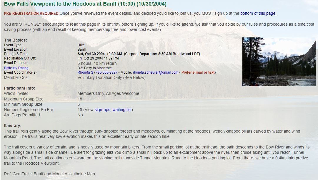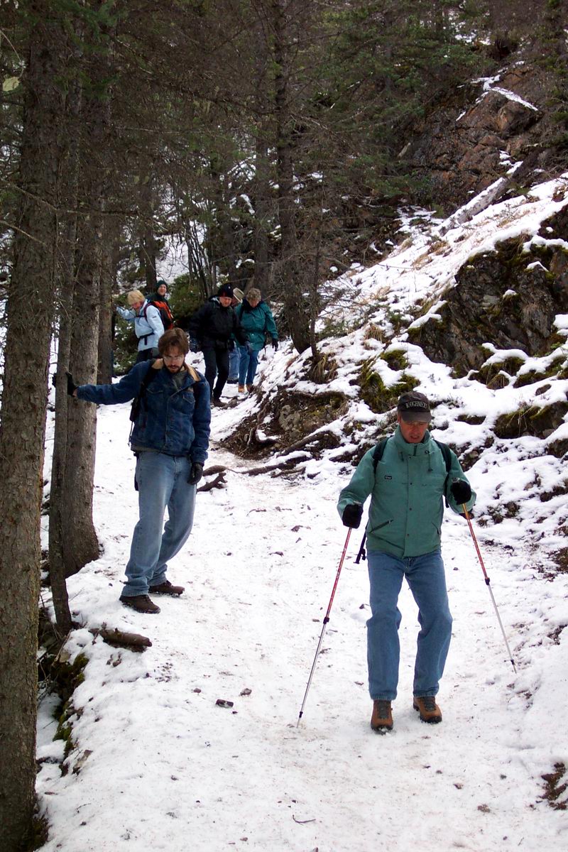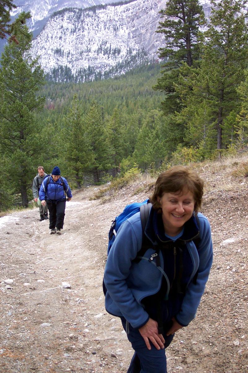 We left beautiful blue skies and lovely temperatures in Calgary and drove out to the wind and flurries of Banff. Fortunately, the flurries were short-lived and the day turned beautiful once again (with a couple of minor digressions). As promised, this was an easy hike, except for a few hills which were treacherous with ice. We took the wrong fork at the trailhead and went down the Hill of Death, but soon joined onto our proper trail. On we continued, on the easy meandering trail, and on down the Hill of Certain Doom. Before we even reached the Hoodoos, Cecilia and Jane's group caught up with us, and after greetings and snowball fights, we became one group. At one point, Samantha had to stop to remove a layer and Cheryl and I nearly saw HER hoodoos. We reached the (Banff) hoodoos and most of us decided we were satisfied with the view from above, while several brave souls tromped on down the hill to get a good close-up view. We all rendezvoused back at a picnic area along the way and then headed back. I, as usual, brought up the rear and gathered up Samantha and Cheryl on their respective potty breaks. When we caught up with the rest of the group, there was absolutely NO chocolate on our breath. If anyone says something different, it is vicious lies. We retraced our steps (mostly), on up the Hill of Certain Doom, and then, since we took the proper trail back, up the Hill of Imminent Injury (but bypassing the Hill of Death). Some folks may have hit the Kilkenny, but most of us bailed at the carpool to get ready for Halloween Parties! -- Rhonda |