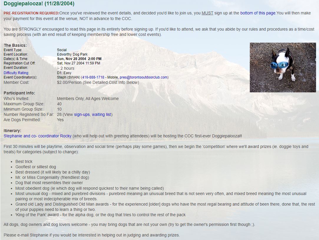 The day went to the dogs at COC's first ever Doggiepalooza!! It was a beautiful day, although a bit chilly especially for the little guys, but that did little to deter them from having a good time. There were a few dog tussles, but for the most part everyone was on their best behaviour. Especially when treats were at stake! Special thanks to our three judges and brand new COC members who took on their role with enthusiasm - Jen C, Twila T and Holly T. It was hard to pick winners because every dog was special, however we did have 10 hotly contested categories... And the winners were: Best Trick: Eskie, for her 'high five' and dancing moves Most Obedient: Magic, for her ability to not only come on command, but was able to stay without being held Best Dressed: Kitty and Diesel for their matching bandannas and hats; Cheryl also wore her matching outfit Best Retriever: There were a lot of competitors, but first prize went to Zena for her ability to catch and retrieve when it wasn't even her turn! Goofiest Dog: Cabo, for wearing his goggles with pride Mr. Congeniality: Cairo, for being a super relaxed generally sweet guy Grand Dame of the Park: Chelsea, for letting everyone know where things stand (and helping herself to some treats) Most Unusual: This was a tight race between Quinn, the Catahoula and Jasper, the Portuguese Water Dog, but majority ruled and Jasper trotted away with the prize King of the Park: Buddy (I) the exuberant Staffordshire pup got extra friendly with all the participants Most Courageous: Buddy (II) the Cocker Spaniel cross puppy also tried to get friendly with all the participants - size was not an issue! But every dog was a winner just for coming out and showing us all how to have a good time, so everyone went home with a prize. Rocky, as co-leader, would have liked to have added a few words, but he fell asleep shortly after getting home and hasn't budged since. I'm sure the other Doogiepalooza participants spent the rest of the day doing the same thing! - Stephanie |