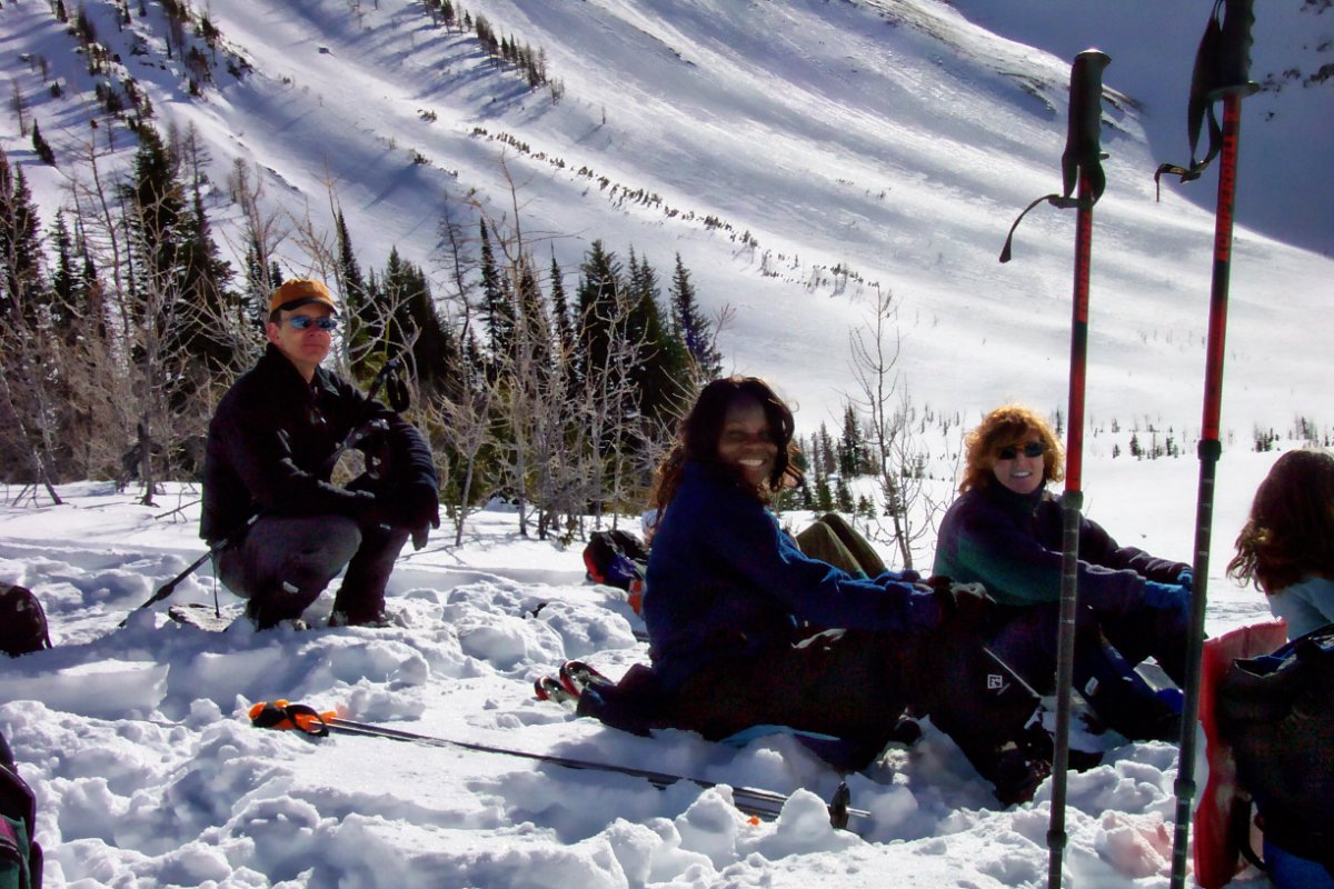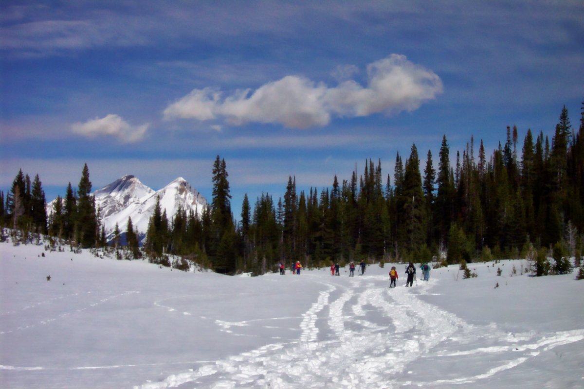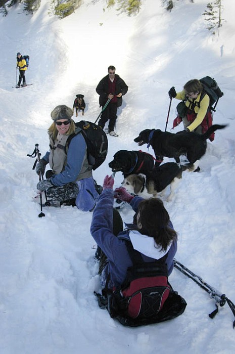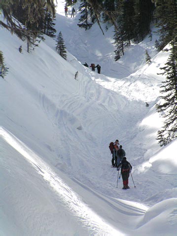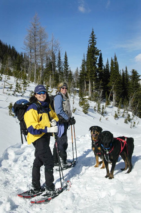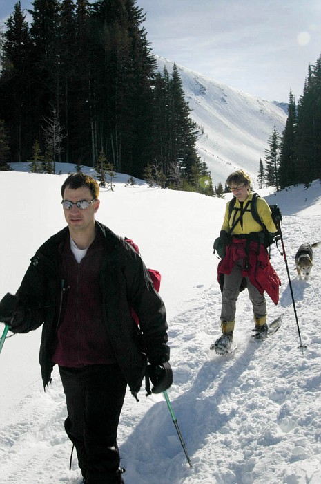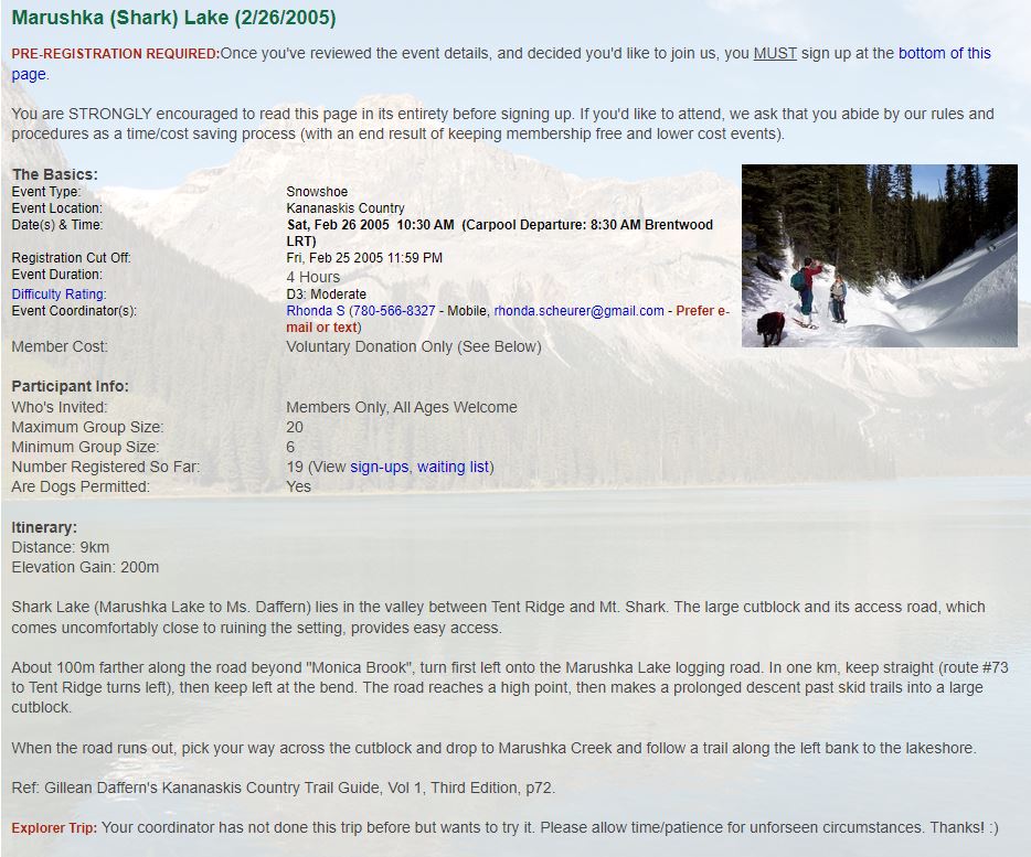 A fantastic snow shoe trip - definitely a keeper! There was a LOT of snow out there. We tromped through the woods for a bit, and then into the creek bed, which was a more challenging snow shoe than anticipated - the snow was thick and heavy, but because we were in a creek bed, it was also very unstable, so it was not uncommon for someone's foot to sink all the way through the trail and into the void below. There were sections where the trail was a narrow shelf, difficult to traverse with wide snow shoes, and there were a few times when the shelf would partially crumble out from under one unsuspecting snow-shoer, resulting in yet another interesting face plant. Fortunately the snow was soft and inviting because I've never spent so much time falling down on snow shoes before (and I wasn't the only one). The trail information was a bit inaccurate, which we discovered as we climbed steadily up to the lake, including one very steep section, which many slid, rather than walked, down on the way back. We gained approximately 200m elevation according to the GPS, which is exactly what it seemed like as well (not the 100m noted in the trip details). It was such a warm and beautiful day, though, that no one minded the extra climb. -- Rhonda After this trip, Mike who led the same trip on Sunday came back with the suggestion that our two trips were so different that it's likely one of us did *not* go to Shark Lake. The general consensus is that it was *my* group who went on a mystery tour, and here is the resulting conversation. :) Marcel: My guess is that we didn't go to either. I suspect that we ended up right in the middle of the Tent Ridge Horseshoe. I think that from where we had lunch , if we had gone forward to what looked like a pass (or low point) on Tent Ridge, we would have been overlooking Tryst Lake. Angie: I get a feeling that it wasn't Shark Lake. Our pictures are nothing like the other pictures. When I get a chance I'll track down a map and see if I can figure it out! Whereever we went was certainly beautiful! I got more of a workout than I was expecting though! Anyone else up for a snowshoe trip to the REAL Shark lake in the near future? Ian: I looked at the guide (Gillean Duffern's Kan Tr Guide #3), I think same one you have. I think we were between tryst and shark lake. I think we went up what shows up on the guide's Topo map as Monica Brook. On that map it looks like we went up the middle of the Tent Ridge Horseshoe, so I don't think we were actually on a trail. I don't think it was Tryst lake because of it's starting point and the direction the sun would have been (it was directly in front of us so we were on a north/south trail, and tryst is more east/west). And of course there was the lake of a real lake........ |