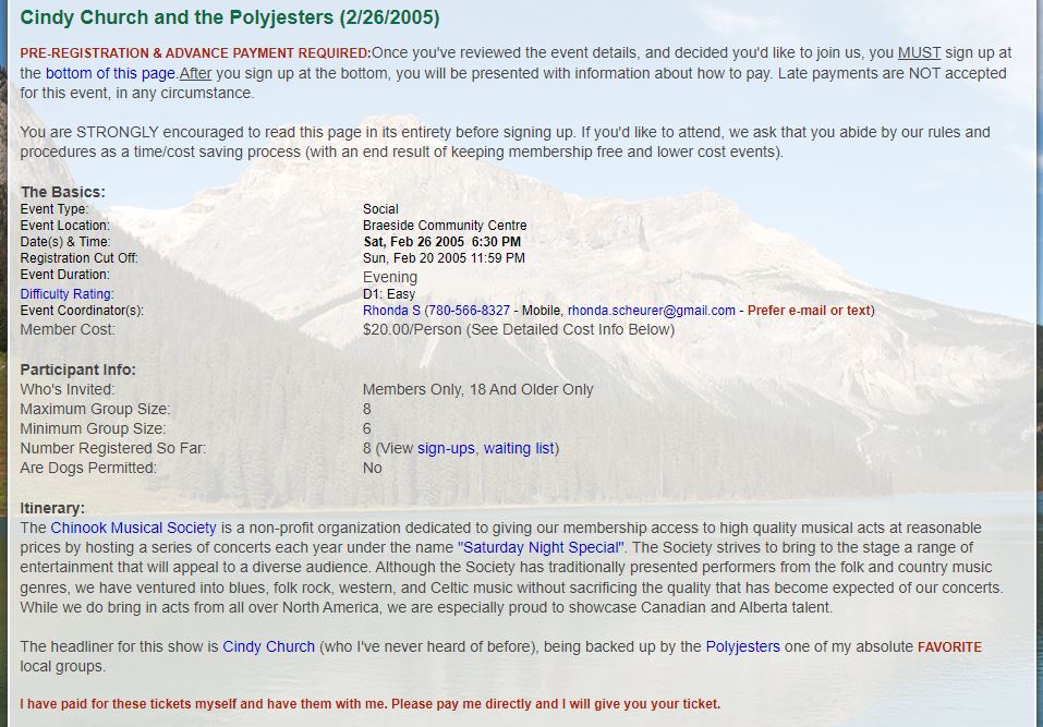 Were the Polyjesters worth it? Standing in line outside the door for 30 minutes waiting to get in, while they let 50%+ of the attendees in pass by us to go in and pre-reserve their blocks of chairs? Sitting in a crowded community hall at cafeteria-style row tables with a bunch of people who think “Saturday Night Special” means sitting perfectly quiet and not being allowed to say anything to your companions through the evening except during designated breaks (yes, they actually have a set of "rules" stating as much)? Enduring the genre-confused and mostly un-talented, uninspired and uninspiring house-band for an hour before the real show started? YES YES YES YES YES!!! The Polyjesters were worth it! These guys get better and better every time I see them. Bridget had seen them before with me once at a house party, but the rest of our gang had not seen them before, and they all agreed – these guys are fantastic!! Well worth the strange Saturday evening setting. Although I doubt we’d go there again… we’ll just have to follow the highly talented and energetic Valleau boys from Didsbury and their band-mates to other, more enjoyable, venues. CDs and more information available at www.polyjesters.com. Most of us left after The Polyjesters, but Wendy and Franco planned to stick around for Cindy Church. Hopefully we’ll hear some feedback on that part of the show, too. -- Rhonda |