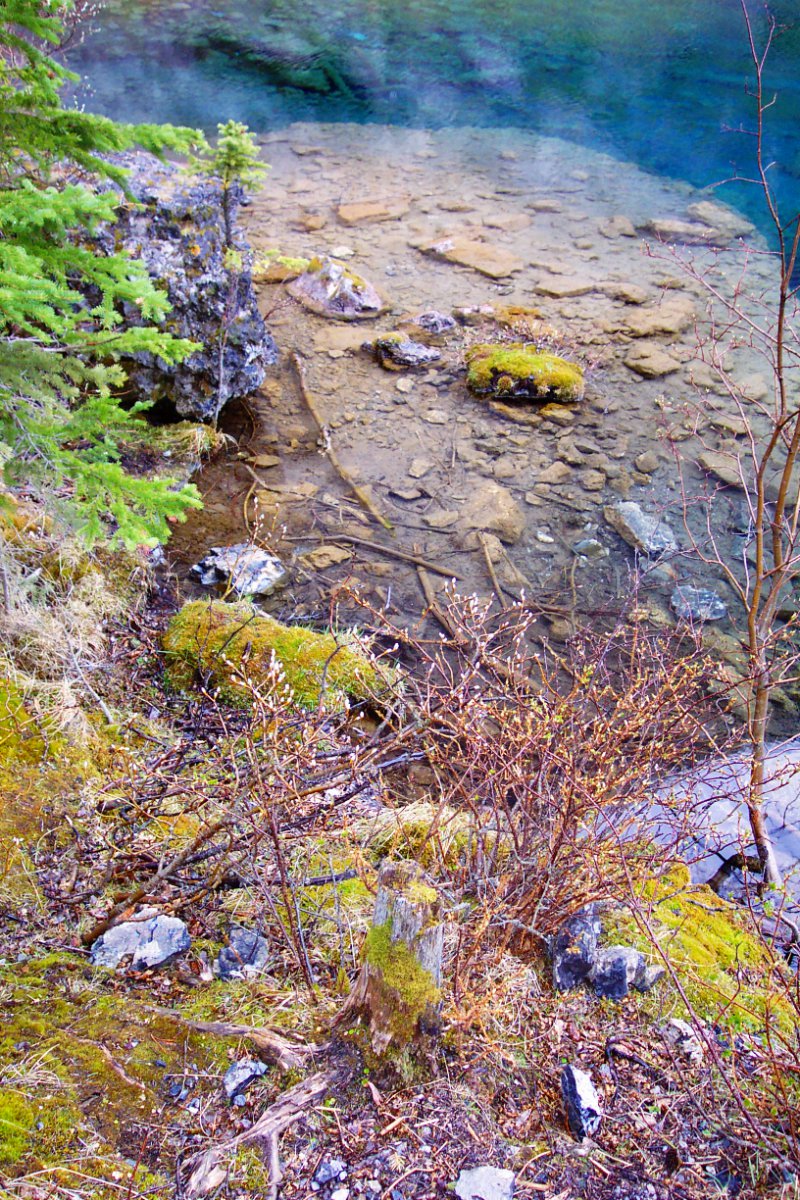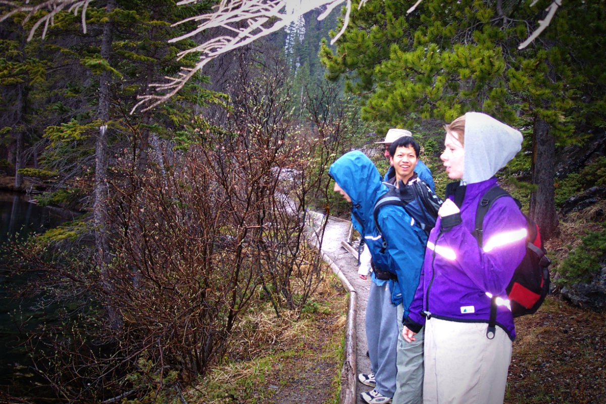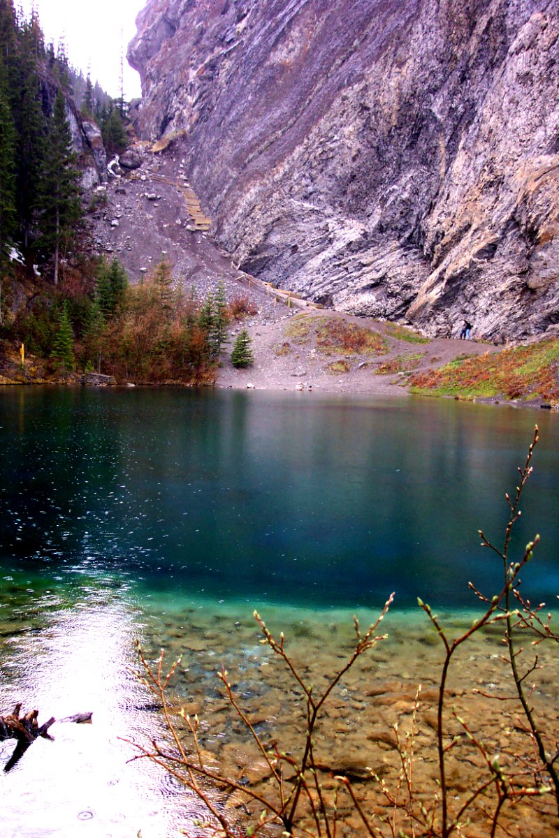 Due to a head cold, the Weather Witch's powers were blocked, and we ended up hiking in a pretty steady drizzle. At least the Witch didn't have the flu, 'cuz it really wasn't that bad. At the base of the cliff (above the second lake), Crackers found what appeared to be the ultimate mountain make-out spot. Amazingly, Polyanna enthusiastically joined in... eeeeeeuuuuuuuuuuuuwwwwwwwww!! The hike was short, the lakes were pretty, and we all agreed it was a perfect short hike for the day. We stopped at The Drake in Canmore for lunch after... mmmmmm... Thai Satay Soup... -- Rhonda |