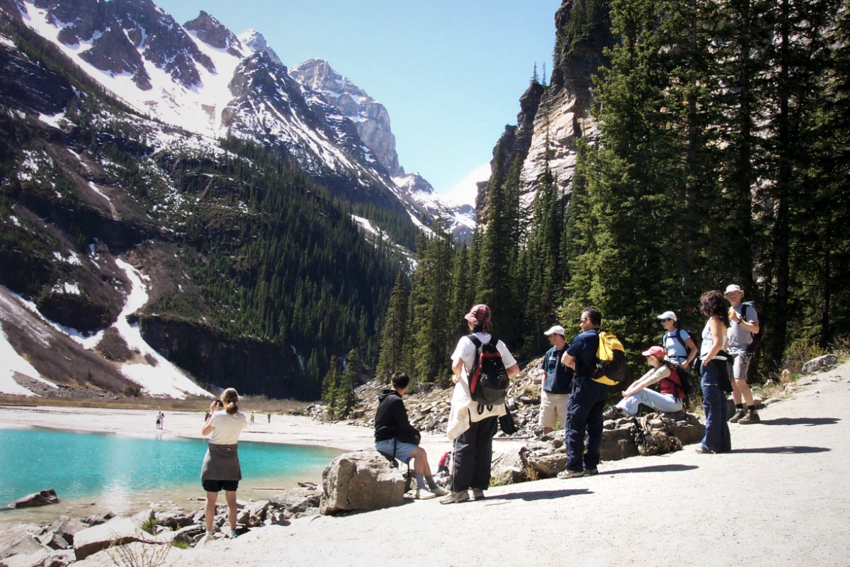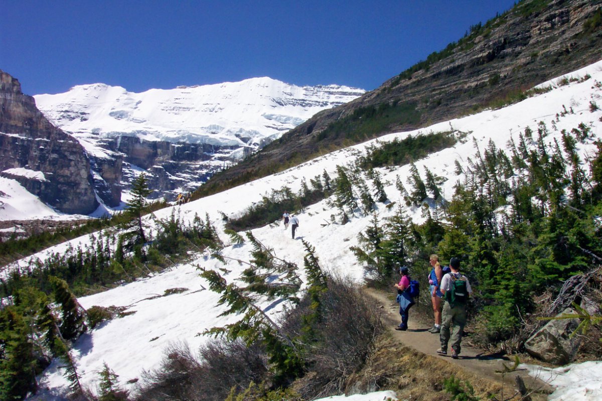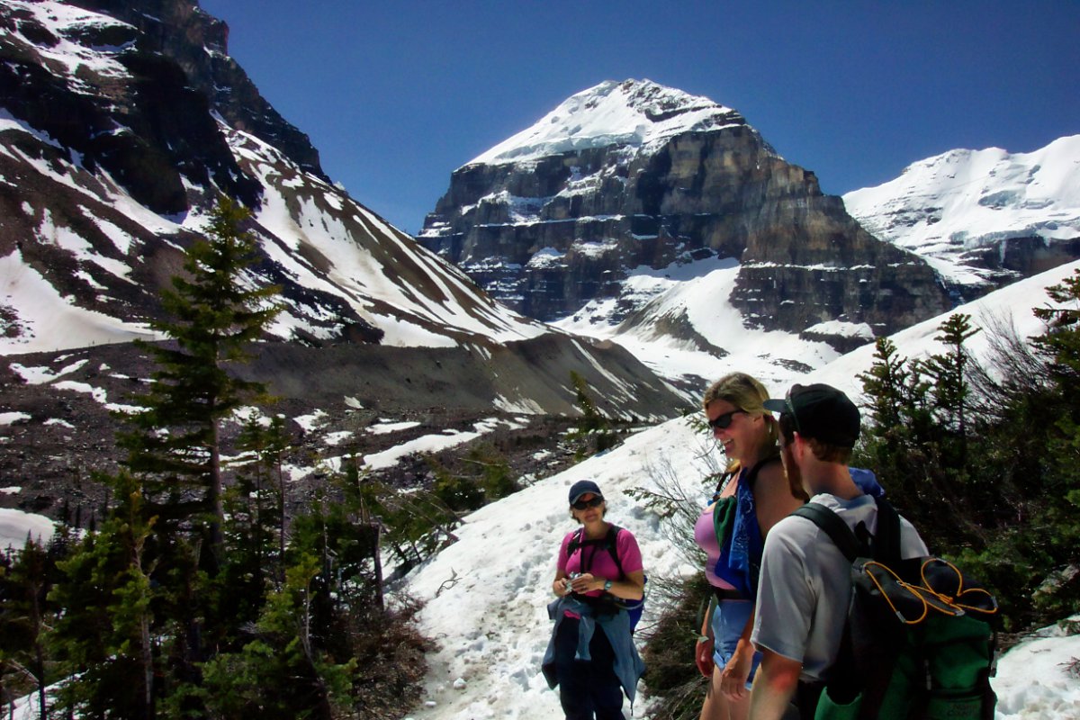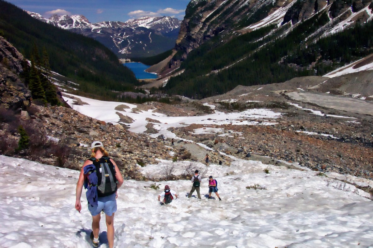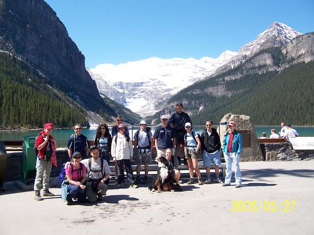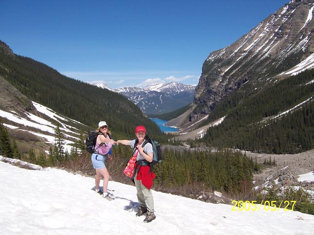 Lake Louise is definitely one of the most spectacularly beautiful places I have ever seen, and with the perfect weather and clear blue skies today it shone at the height of its brilliance. Higher up on the trail there was still lots of snow for added fun and hilarity, but who knew that the Plain of Six Glaciers Tea House was set to open on Saturday May 28th - we missed it by one day!! D'oh! A couple of us lounged at the Tea House area while the rest hiked the remaining 1.3 km up to the end of the trail. Just as they returned, we were treated to a spectacular avalanche that fell near (behind) the trail they were on (the trail seems to have been built specifically to keep people out of the avalanche run area). One new nickname today - from now on Doug B will be called "White Rabbit". It was so great to have Claudia join us again finally - we were only able to coax her little Spanish butt out on one winter event, so we've really missed her! -- "The" Rhonda |