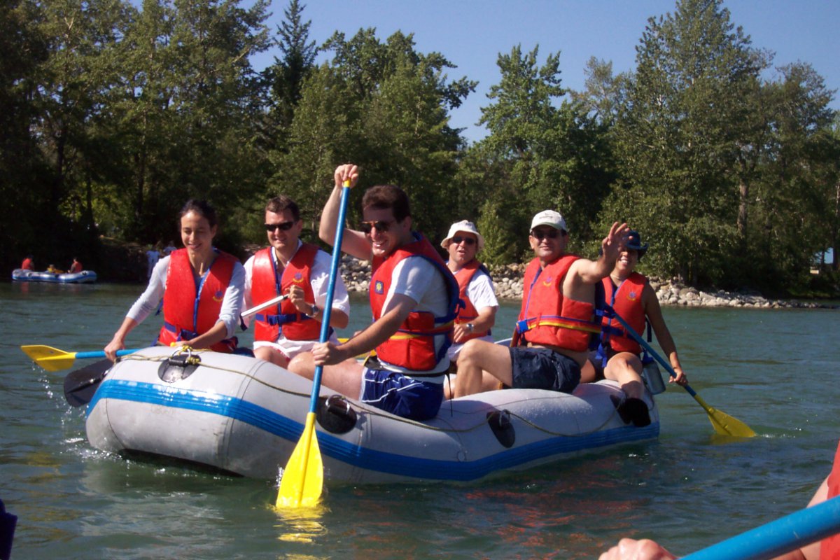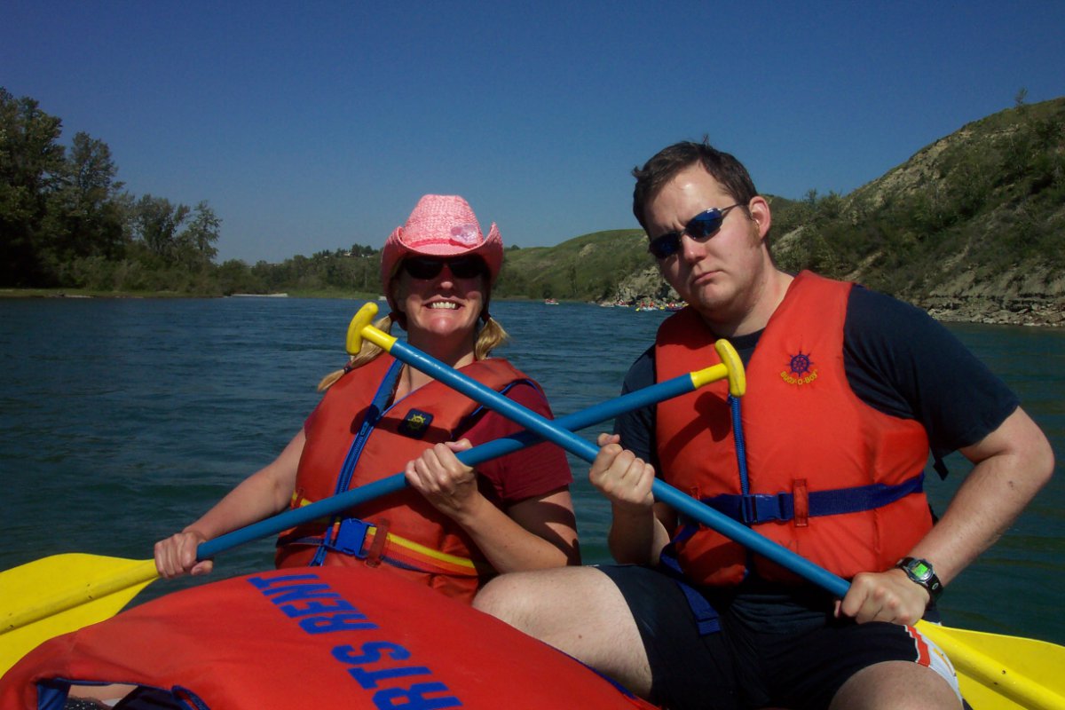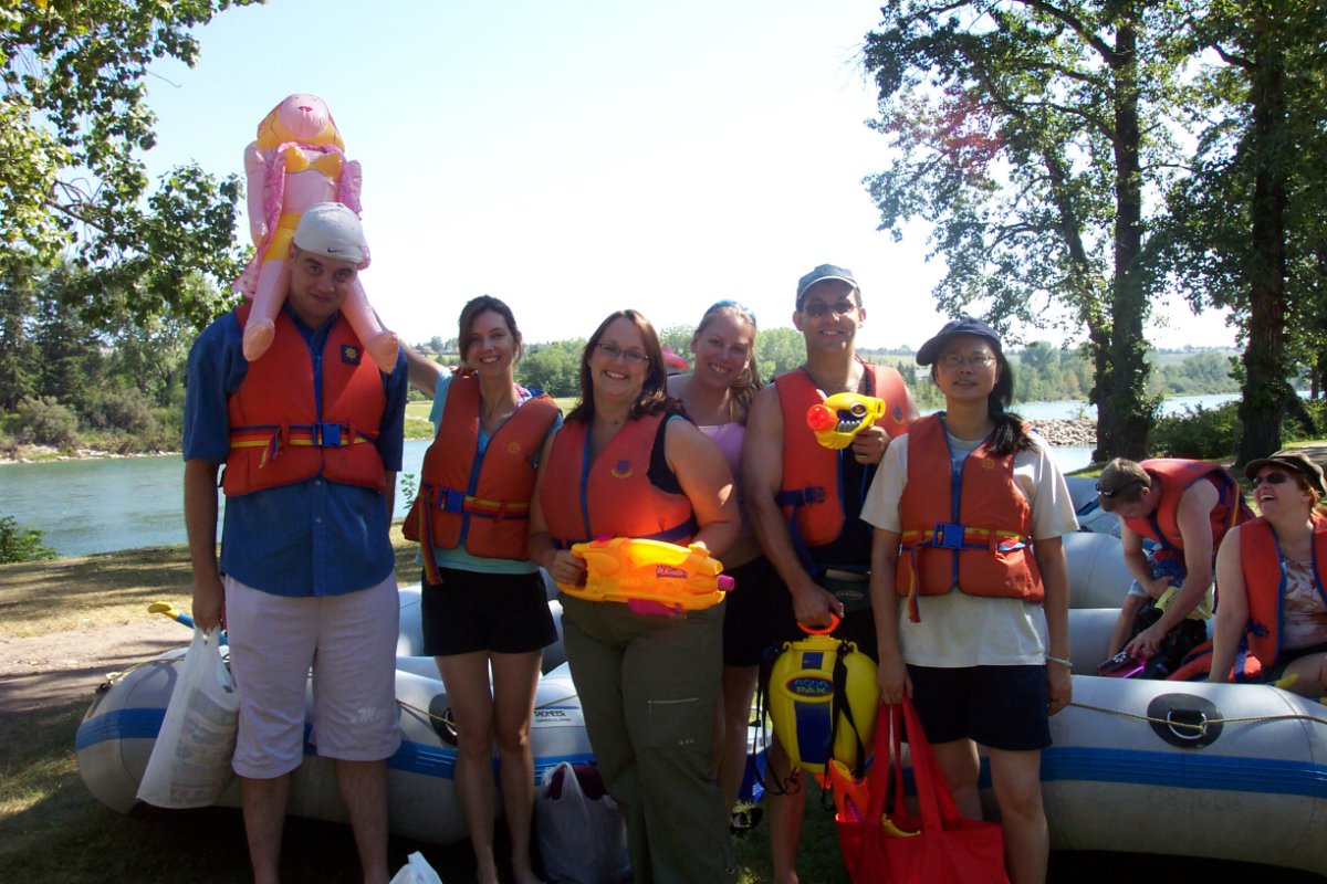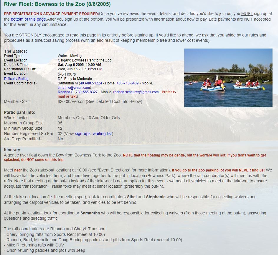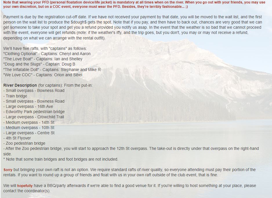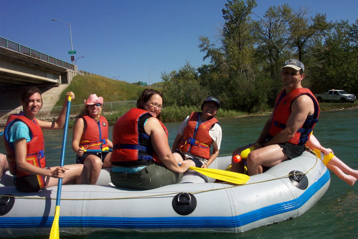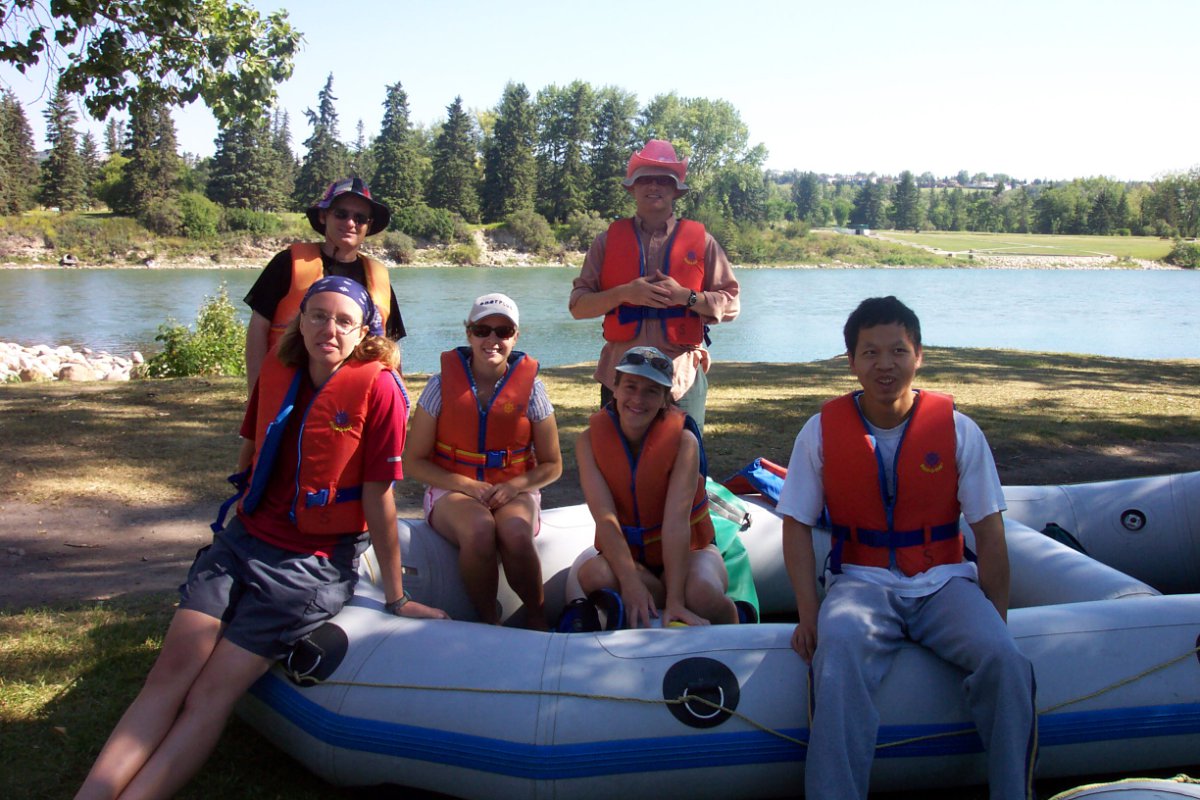 A couple of lessons learned today with this one: Make sure we have the details nailed down about exactly WHEN and WHERE people are to meet... but everyone forgave me, and I do believe we're close to having all the kinks ironed out of our "big group river rafting" events process. :) We set out to spectacular weather, and although it was extremely hot in the city today, down on the river it was warm with a delicious cool breeze. We had our pacifistic "Love Boat" captained by STFU-Ian and Hot Shelley, the warrior ship "Inflatable Doll" captained by Niagara and Maritimer Mike, the international "We Love COC" raft captained by "Mushroom" Sibel and Orion, the laid back "Doug and the Slugs" captained by "White Rabbit" Doug, the flag ship "Clothing Optional" captained by "Frou Frou" Cheryl and Aaron, and the rogue pirate ship (not on the official roster) captained by "Safari Phil". Philip had a name for his raft, but I don't remember what it was, and the rest of us decided that it should be called "Size Doesn't Matter", anyway. Put-in was down at Bowness Park where those of us on raft duty gathered to inflate rafts (and dolls) while waiting for the take-out carpoolers. There was some confusion, as I mentioned, about meeting place, however, everyone eventually turned up and we were off. Floating down the first section, we passed the river-level Bowness houses (pretty snazzy), and the Silver Springs, Varsity and other neighborhoods on the hill across the way. Passing Edworthy Park, we started to see downtown Calgary's pretty skyline followed by some even snazzier condos (and speculated about their prices). Many raft wars raged behind us as we deftly avoided the warships and "Size Doesn't Matter", the crew of which apparently had a case of "little raft syndrome" and thought they had to take on everyone on the river. Past downtown we found our take-out directly underneath St. George's bridge (just past the footbridge at the Zoo), which was kind of overgrown, and partially blocked by a log, but it was still there, much to our relief (next stop, the Weir of Death). Being the first raft out, by a long shot, the "Clothing Optional" crew set up an elaborate water ambush from St. George's bridge, however, due to premature ambush-ulation, only a couple of folks got a bit of a splash. A jolly good time, with many moving on to Philip's house after for an apres-float party. -- "Pudge" Rhonda from "Clothing Optional" |
