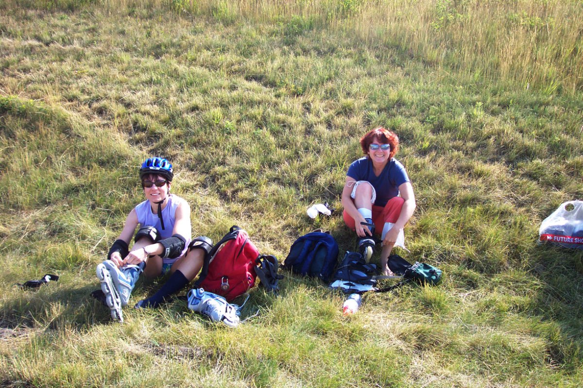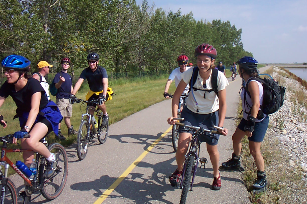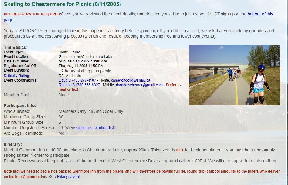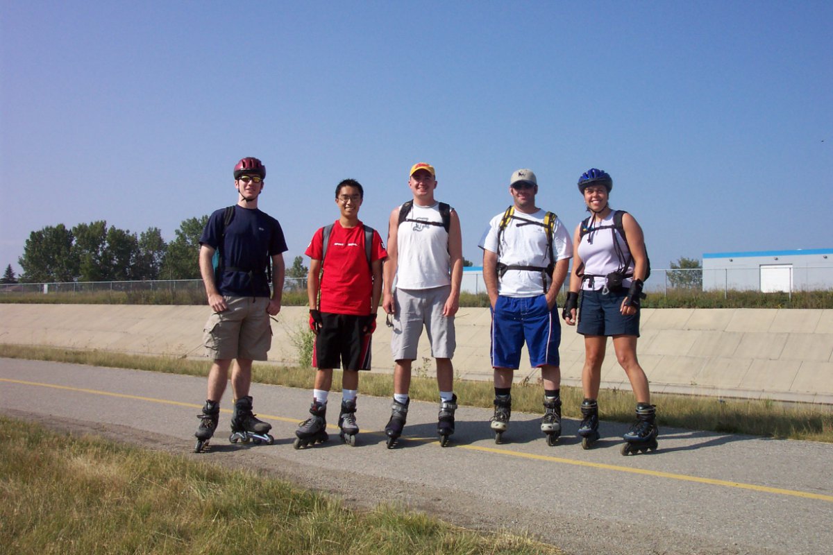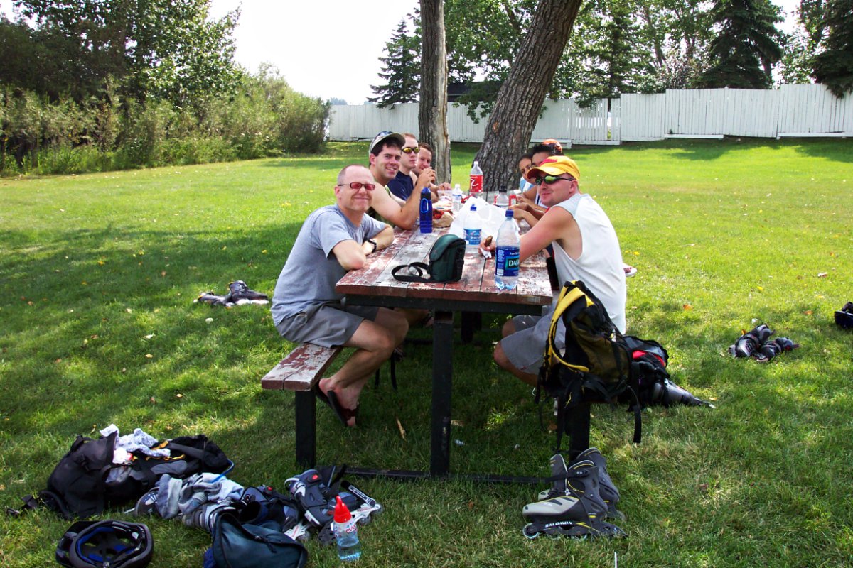What a great day! Oh, deja vu... that's what Doug C said about the biking event. This is the second time we've attempted this combined biking/skating event, and interestingly enough, where last year the bikers were sitting around for an hour waiting for the skaters, this year it was the other way around. Next time, both groups start at the same time (no need to handicap the bikers as long as we have strong skaters). I started off the day in a very relaxed way, and was on my way to the event WAY early, which is good because when I was ALMOST THERE I realized I had left my skates behind at home! D'oh!! The really funny thing about that is that last year when we did this same event, I forgot my skates in my car which was left at Chestermere for carpooling and Cam had to drive me all the way back to get the skates. It was a LONG time before he let me live that one down. Anyway, today was excellent. We had 10 skaters to start with and Ian showed up later (with his "tail"). Lada, who has skated no more than 5km before in her life opted to skate the whole round trip (as did several others) and skated 45kms!!! Way to go Lada!! Mike (aka "Nibbly") demonstrated "The Chad", which is a very cool skating technique. Rumor has it that Doug C promised his bikers a coffee to anyone who knocked a skater down when they met up with us, or if it was ME who was knocked down, the prize would be a beer. The only one brave enough to make an attempt was Mike W. However, he told me what he was doing as he was doing it so I escaped by promising him TWO beers if he would refrain from knocking me down. We were only about 5km from Chestermere when the bikers finally crossed our paths, so we knew we'd be waiting at the picnic area for them for a while before they got there. My lunch was stashed in Doug C's car, so I got to sit and watch everyone eat their lunch (Doug B tossed me an apple to tide me over) while waiting for the bikers. About half the skaters got tired of waiting and decided, instead, to skate the 25km BACK to Glenmore. They figured they'd be back before us (by the time we waited for the bikers and then they had their picnic lunch). Boy, were they wrong... we had been sitting in the Glenmore Inn lounge enjoying a cold one FOR AN HOUR before they made it back in (although they were, rightfully, very proud of themselves). -- Rhonda |