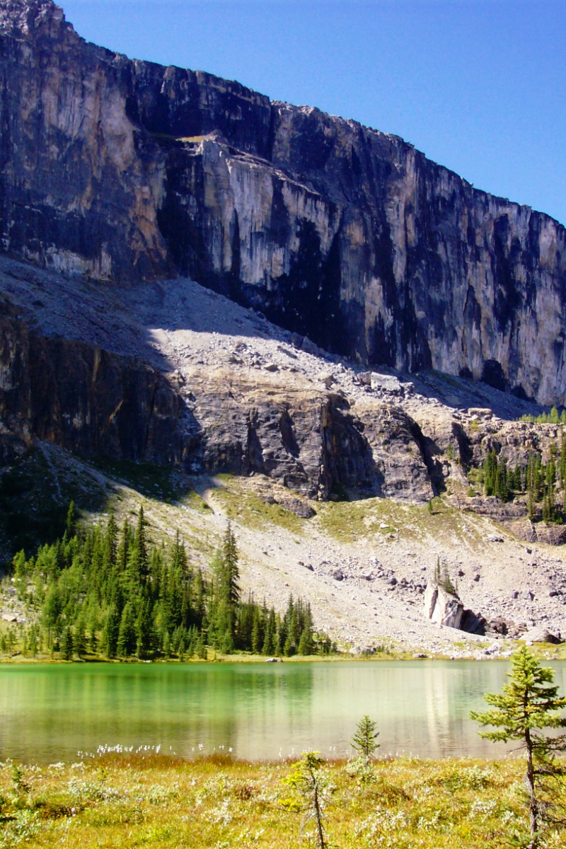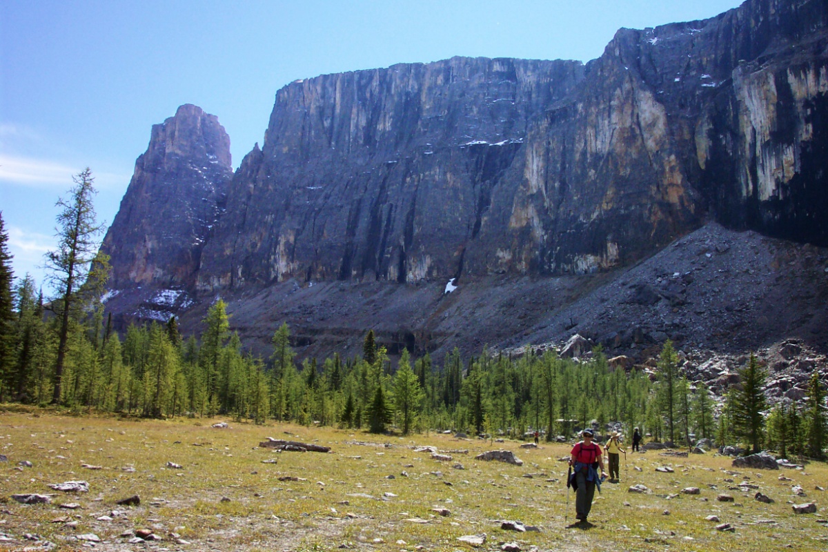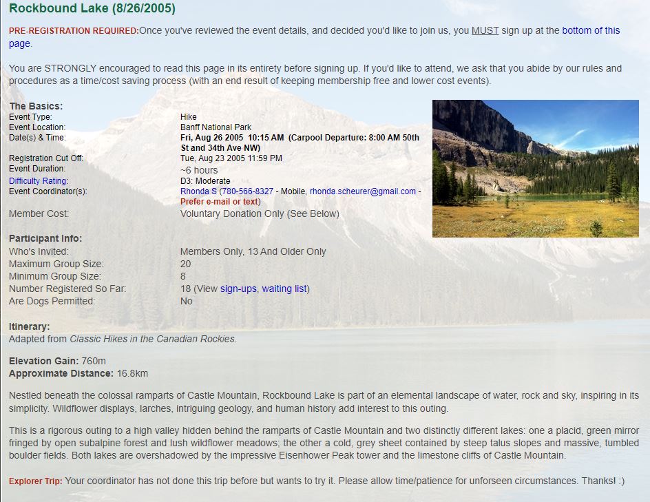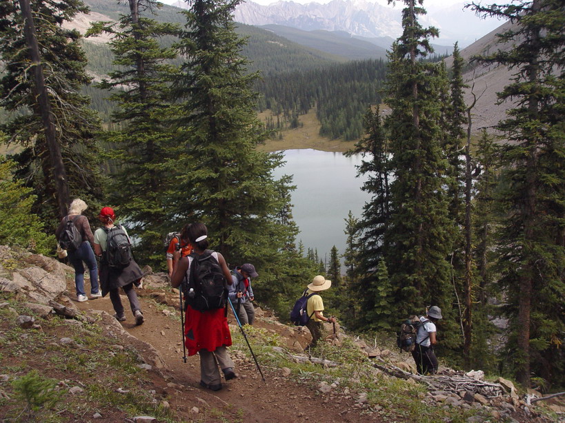 There is a reason my mother calls me "Grace"... and today I demonstrated that reason to four hikers when, shortly after beginning our descent, I did a fancy, multi-step stumble forward, hoped in vain that I would right myself before completing the tumble, and before coming to a final stop in a prone position, watched my pinkie finger on my left hand bend all the way backwards to touch the back of my hand. Back at the trailhead I showed it to everyone (it was back in a near normal position) but only three were brave enough to touch the inverted knuckle. Bunch o' wusses. As I write this, it is 6.5 hours later, and I am still waiting for the pain to kick in. The doc says not to worry... it will be here by morning. At least I didn't have to deal with the torture of sitting in emergency for hours and hours; Marg took me to a walk-in clinic, and they had me X-Rayed and patched up and home in less than an hour! So, I guess maybe you want to hear about the actual HIKE, too. Well, it was fantastic. Definitely a keeper. It's a long slog in on a forested trail, gaining 700m of elevation over 8km. A nice gentle grade. Near the end, the boring trail opens up and you are rewarded with great views of the side of Castle Mountain, beautiful Tower Lake, and Rockbound Lake, which wouldn't really be that great except for the spectacular black cliffs providing the backdrop. Anyway, it was great. If you want to know more, ask me in person, because my finger hurts and I'm going to stop typing now. Many thanks to those who helped take care of me today. -- Rhonda |
