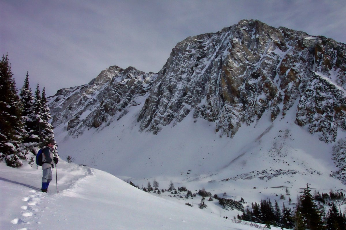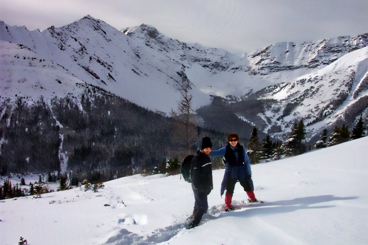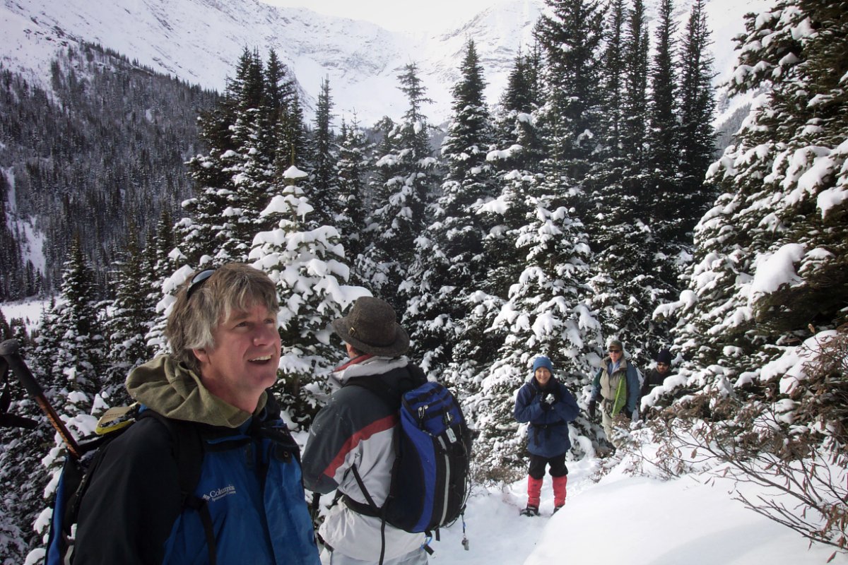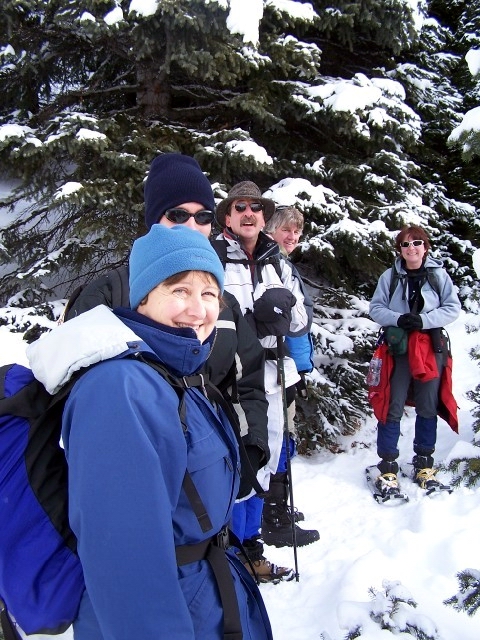 YAY for Birthday Brownie!!! With a beautiful day, including some in-between conditions, we set out with two on snow shoes, one in Icers, one in Yaktrax, and two in boots for a most excellent early winter hike. I had set a hike up for today because it was my birthday (39 - eek!!), and chose one of my absolute favorite places to go. I couldn't have planned it any better - we had a spectacular day, augmented by good company, and BIRTHDAY BROWNIE!!! Marg and David were staying out in K-Country over the weekend, and brought along a birthday brownie, which they prepared and presented to me about halfway up. We transported it the rest of the way up to our "lunch spot" (just below the actual turn-around point of the Ptarmigan Cirque interpretive trail) where Marg and Ed managed to light the sparkler (which, in turn, spun the mini-pinwheels). For most of the first part of the trail, I felt that the snow shoes were completely unnecessary, but as we finished the elevation and broke out of the trees, we found ourselves in about 2' of snow the rest of the way and I had to break trail to the lunch spot. I NEVER break trail. Never! I'm always at the back of the pack, so I've never had the "pleasure" before. It was um.... nice to try once. About half way up, we stopped for a while to watch some snowboarders who had lugged their boards all the way up to the peak of the mountain across the road and then boarded down. It took them well over an hour to get up, and not more than a couple minutes to get down. Whoa. Thanks to all of you for sharing "my" day with me. It was perfect!! -- Rhonda |