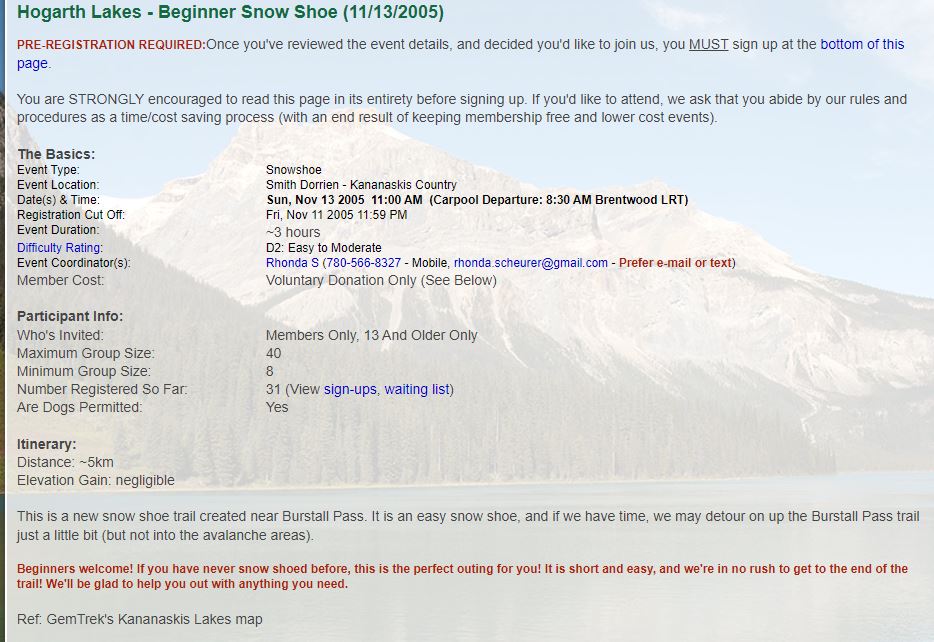 This was a fantastic beginner event! We had 31 people out today, many for their first time ever snow shoeing. We set off around the Hogarth Lakes trail, and before we'd even gone one kilometer, came to a large open stream. A few people tried to cross, and many ended up with wet feet (and some with wet legs). One of our group had heard from the info center that the other side of the loop was even worse for water hazards, meaning we'd have to return this same way, and so we decided instead to turn around, and venture a ways up the Burstall Pass trail instead. When we got back to the intersection, some opted to stay back and practice snow shoe skills with the pristine meadow and great little hill, while others started up Burstall Pass. The "slow group" turned into the "stop and have lunch and turn back early group", and upon their return, they had a play on the great little hill, followed shortly by the "went all the way to the first Burstall Lake group" who also played on the great little hill. When it was time to go, we kept the big vehicles back to make sure the little guys could get out of the snowy parking lot - we were all ok, but we did help a family get their car out of the lot (they were lucky we were loitering around to do car pushing duty!). Several of us ended the day at Kilkenny. Before the day had even started, we lost a car, and I hope that Julie, An and Karen made it back to town ok (Julie had injured herself on the way up, although reports were conflicting about exactly what happened... it happened when she jumped out of the car to try to help Ken, who'd gone in the ditch on the Smith Dorrien). -- Rhonda |