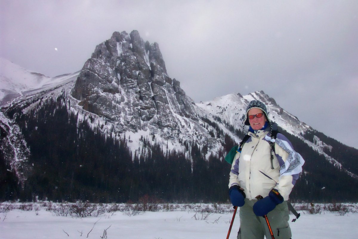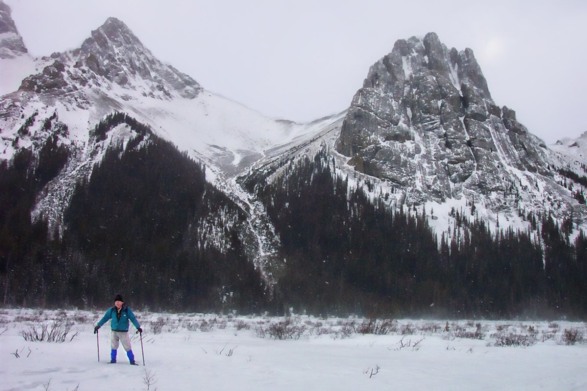 A fabulous beginner snow shoe day! We had some wind at the start of the day, but other than that, the conditions were pretty much perfect. We went up the Burstall Pass trail to the point where we could see the first of the Burstall Lakes and then continued on up until we got to the marshy area. It was too windy/cold there for lunch, so we turned around and figured we'd have lunch back in the trees, but Chris suggested going back to civilization instead so we went to the Pocaterra Hut and had our lunch with a lovely fireplace and indoor plumbing.
